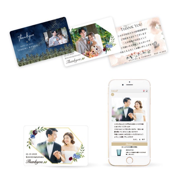 ヒキカは新郎新婦毎のデザインされたギフトカードを1枚から1組2,500円(税抜)で安価に制作することができるので、お二人の感謝の気持ちと大切な日を覚えていただく記念になる。