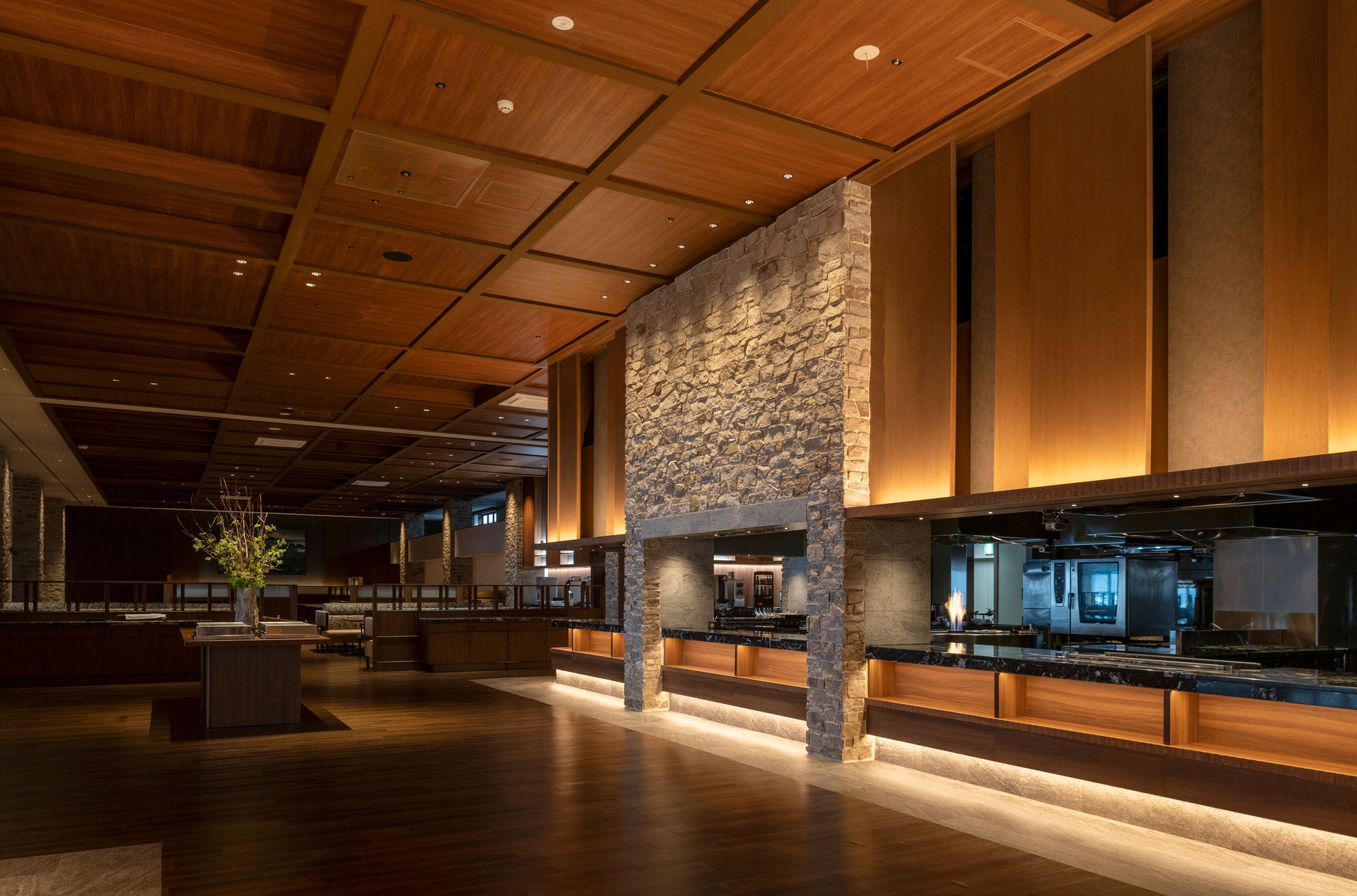 知床を楽しむKIKI知床のメインダイニング「ツリーサイドブッフェ」。アウトドアを彷彿とさせるセンターグリルはライブ感満載。味はもちろん、香りや焼き音、彩りからも魅力あふれる食事を、木の温もりに包まれた開放的な空間でお楽しみください。