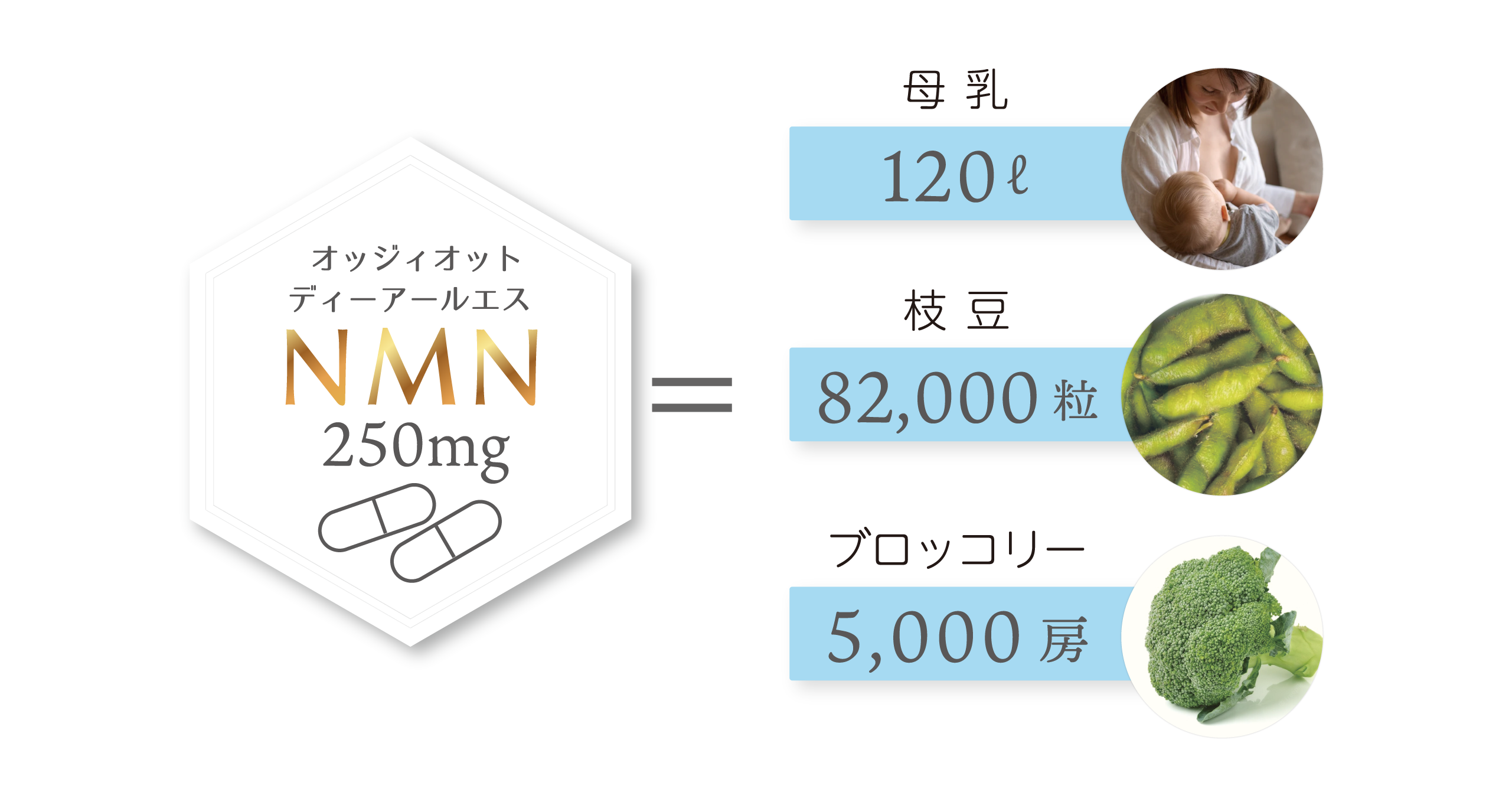 一日推奨量であるNMN250mgを補うためには枝豆では82,000粒、ブロッコリーでは5,000房が必要で、食事から体感できるほどのNMNを摂取することは難しいといわれています。