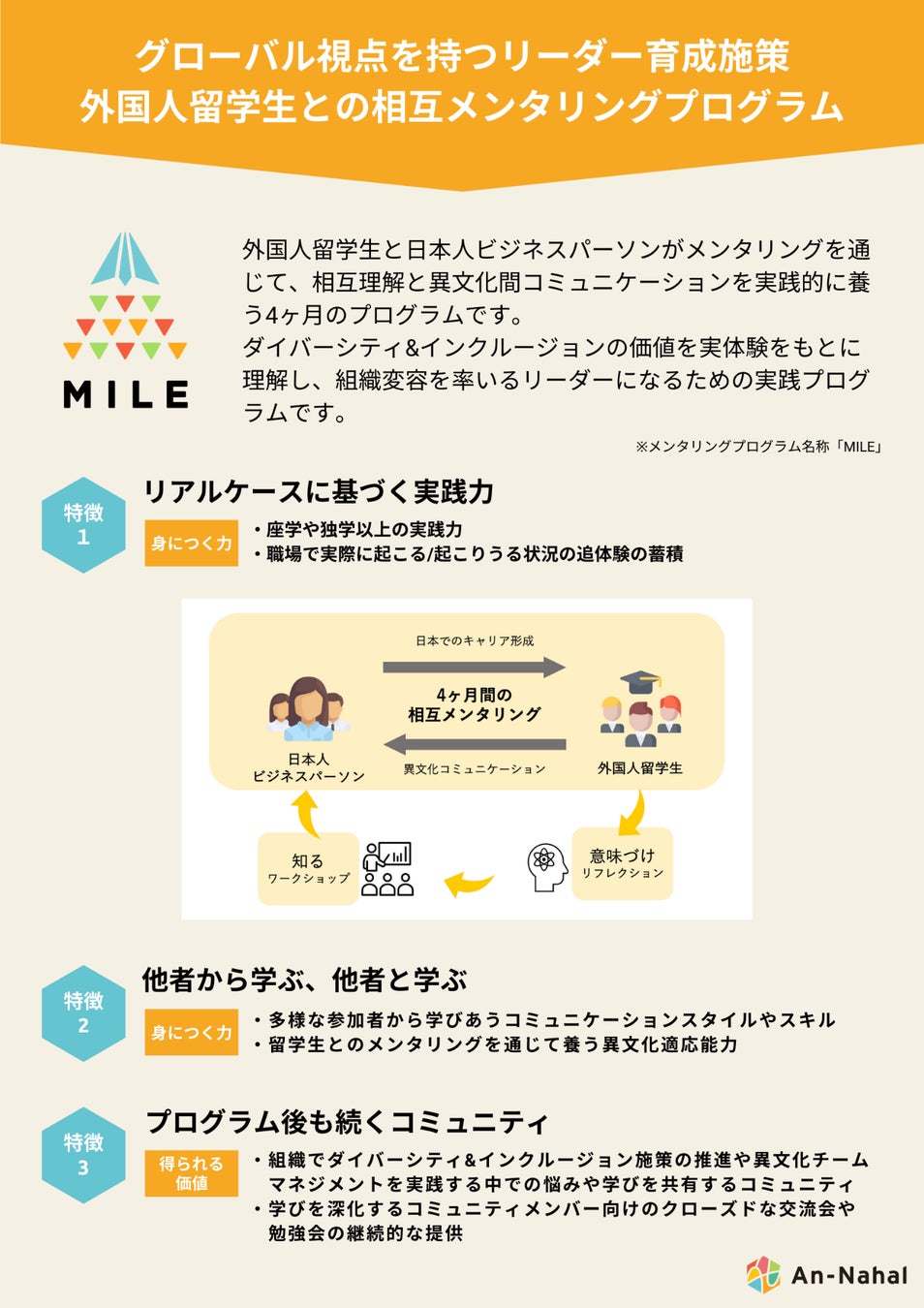 留学生とのメンタリングやワークショップを通じ、異文化適応能力、リーダーシップ、外国人材活用の実践的なスキルを身につける4ヶ月の研修プログラムです。外国人材活用やダイバーシティ推進に取り組む企業様の実践力のあるリーダー育成に最適な内容です。