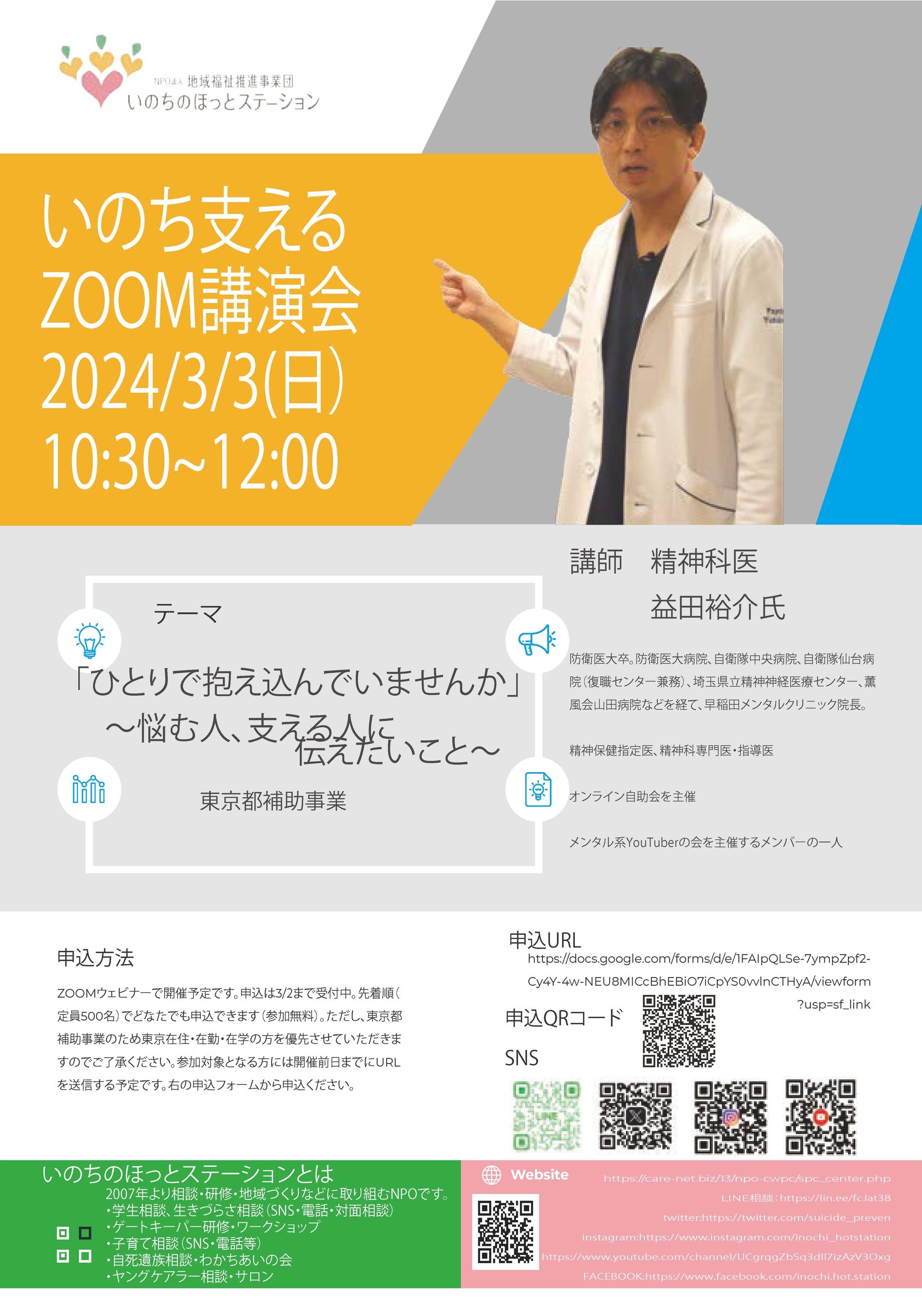 ❀いのち支える講演会「ひとりで抱え込んでいませんか」~悩む人、支える人に伝えたいこと~精神科医 益田裕介氏(早稲田メンタルクリニック)❀いのちのほっとステーション