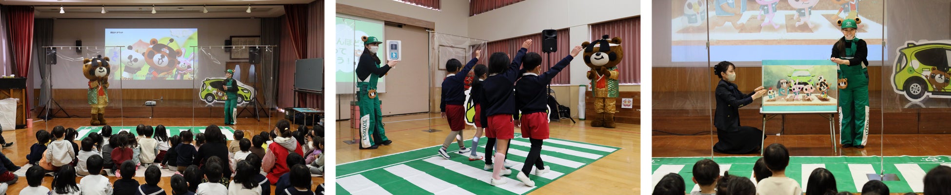 岡山トヨペットは、2014年9月から開始して以来、154回(2024年4月5日現在)交通安全教室を行っています。交通安全教室では園児に紙芝居を用いて交通安全について楽しく分かりやすく伝えています。その後、紙芝居で学んだことを復習するためのクイズや、横断歩道を渡る練習、さらに岡山トヨペットキャラクター・くまるの「交通安全ダンス」を園児と一緒に踊るなど、小さい頃から交通安全に対する知識が身につくよう学んでいただいております。