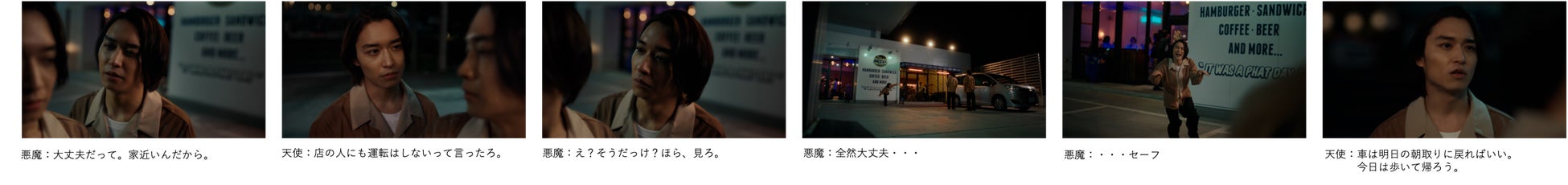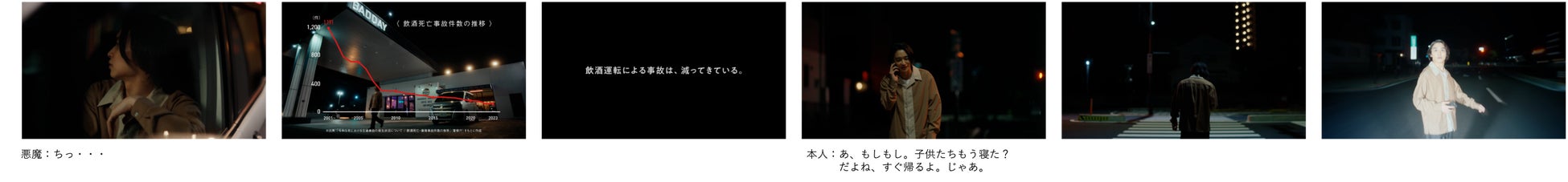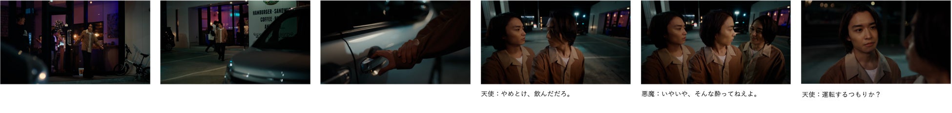 夜、バーからほろ酔いの男性が出てきます。駐車場に停めてある車のドアに手をかけた瞬間、“天使”がその腕をつかみ「やめとけ。飲んだだろ」 と制止します。すると背後から“悪魔”も現れ、「いやいや、そんな酔ってねえよ」と反論します。天使と悪魔の押し問答に戸惑う主人公でしたが、悪魔の甘い言葉に促されて車のドアを開けます。しかしその瞬間、後部座席に設置されたチャイルドシートが目に入ります。「自分ひとりの問題じゃないんだぞ」という天使の声で運転を思いとどまり、徒歩で家路につきます。妻に電話をかけ、子供の様子を聞きつつ、もうすぐ帰ると伝えて電話を切ります。横断歩道を渡ろうとしたその時、突如ヘッドライトに照らされて振り向いた主人公を襲った衝撃の結末とは——。