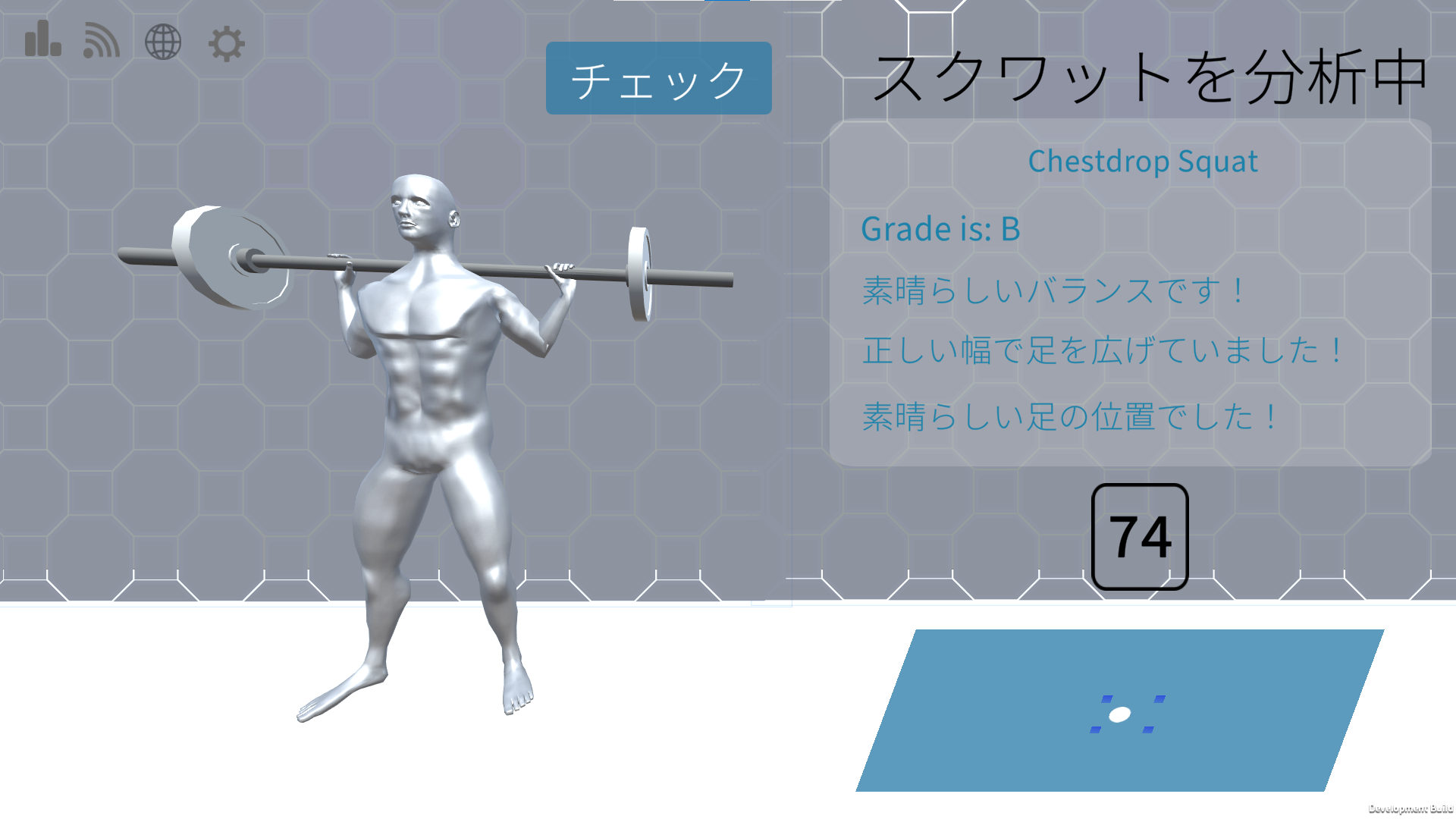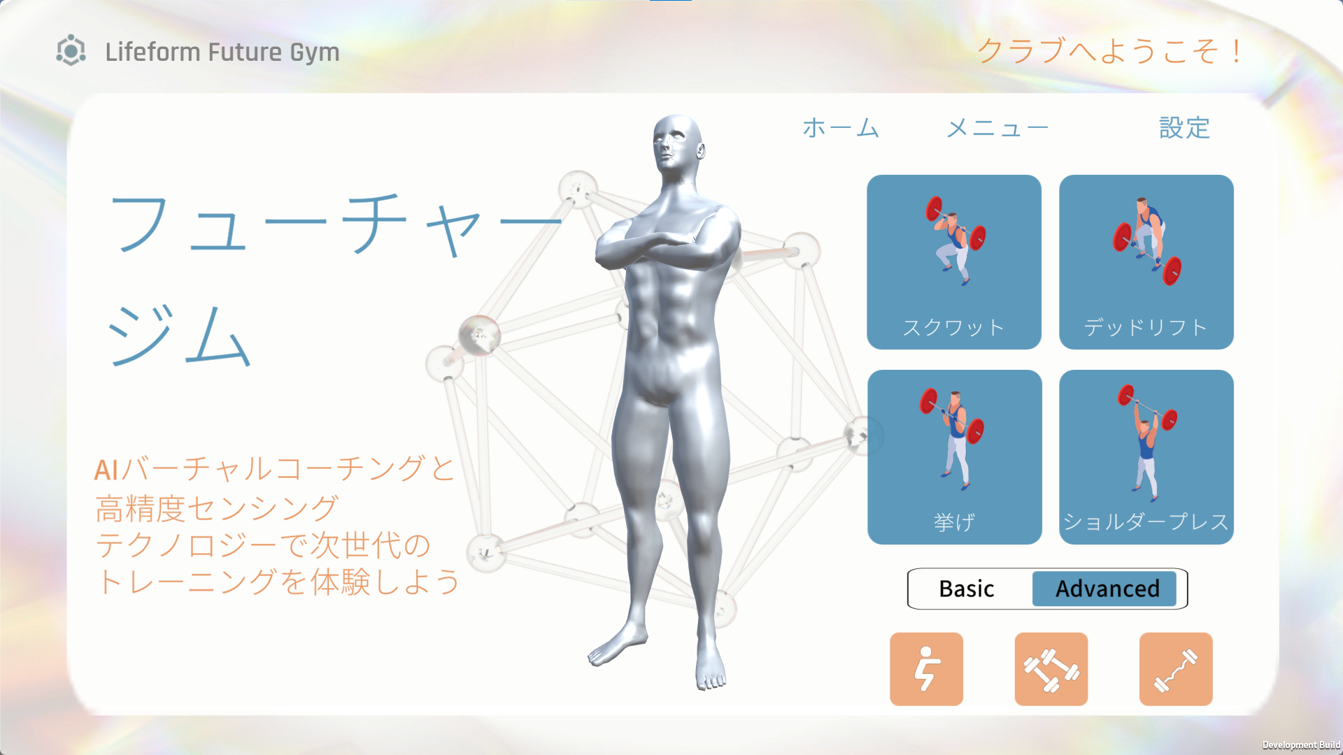 スクワット、デッドリフト、バーベルショルダープレスなどの人気トレーニングを、画面上のAIトレーナーによる指導で習得することができます。