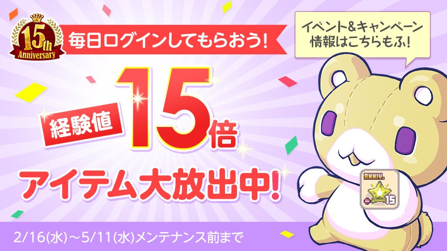 期間中ゲームにログインするだけで、一定時間経験値が15倍になる特別なアイテムを入手できたり、経験値が2倍になる特別な日をご用意したりと、15周年を記念した様々なイベントを開催しています。この機会にぜひチョコットランドをお楽しみください。