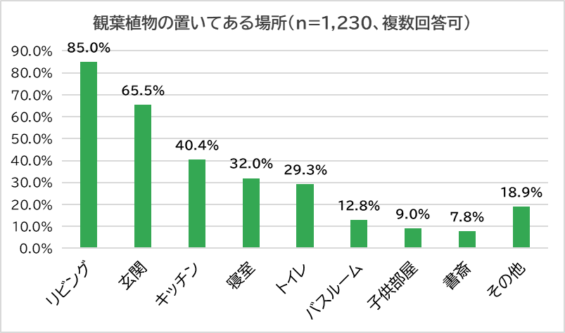自宅に観葉植物があると回答した人に置いてある場所を尋ねたところ、半数以上の人が「リビング」(85.0%)、「玄関」(65.5%)と回答しました。