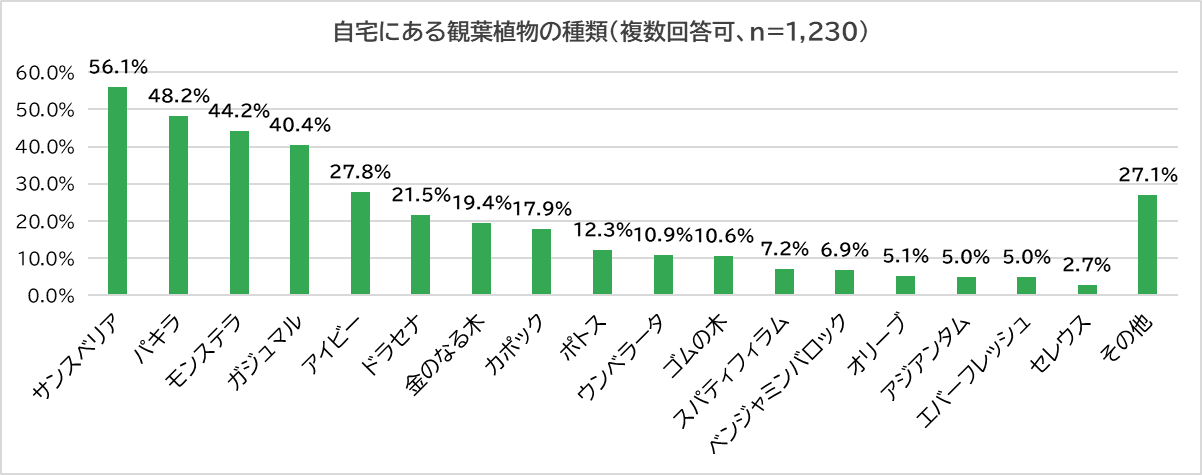 では、どのような種類の観葉植物を置いているのでしょうか?1位は半数以上の人が置いていると回答した「サンスベリア」(56.1%)でした。2位は「パキラ」(48.2%)、3位「モンステラ」(44.2%)、4位「ガジュマル」(40.4%)、5位「アイビー」(27.8%)となりました。