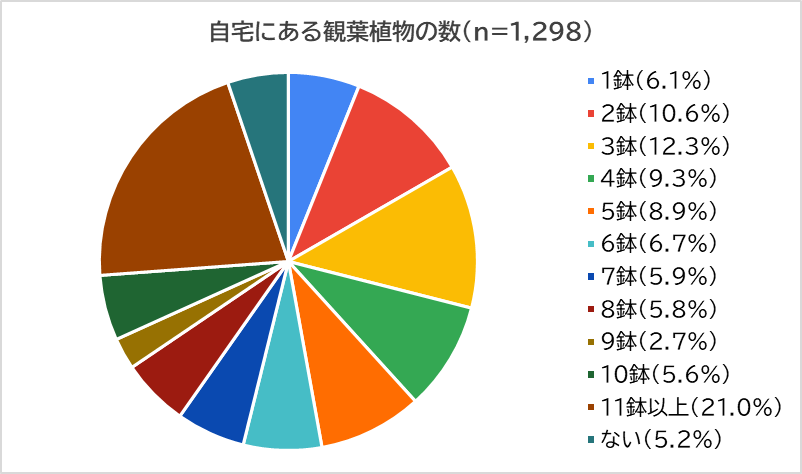 自宅にある観葉植物の数を尋ねたところ、「11鉢以上」(21.0%)が最多で、以下「3鉢」(12.3%)、「2鉢」(10.6%)、「4鉢」(9.3%)、「5鉢」(8.9%)となり、「ない」はわずか5.2%でした。部屋の数や広さ、観葉植物の大きさなどにもよりますが、94.8%もの人が何らかの観葉植物を自宅に置いていることがわかりました。
