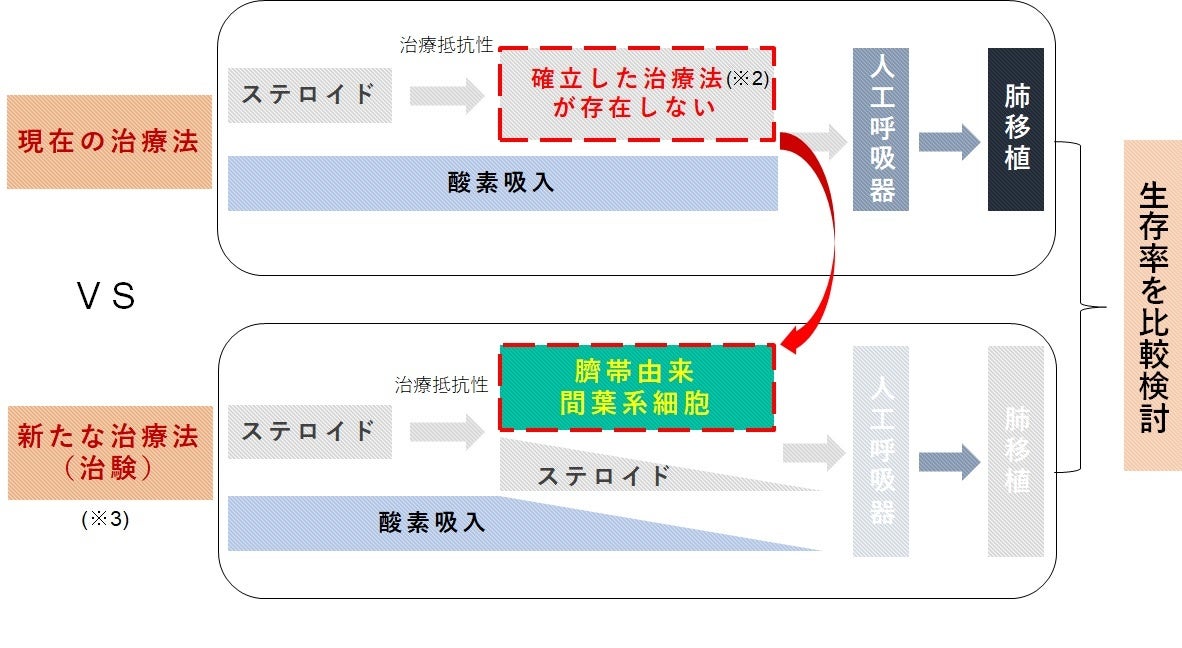※3 本治験では、臍帯由来間葉系細胞の投与により、基礎治療としてのステロイドおよび酸素吸入量を減少させる、もしくは離脱させることで人工呼吸器に至らしめない治療法を目指します。結果として、生存率が向上することを期待します。