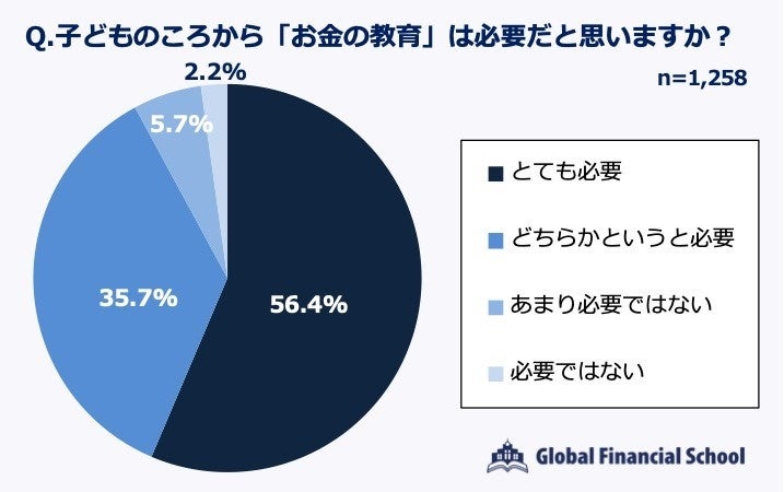 回答した親のうち、子どもの頃から「お金の教育」は「とても必要」と答えた人は、1,258 人中 709 人にのぼ り、半数を超える結果となりました(56.4%)。また、「どちらかというと必要」を選んだ人も 35.7%と高く、 少なくとも何かしら教育が必要と考える親は全体の9割を超える(92.1%)結果になりました。