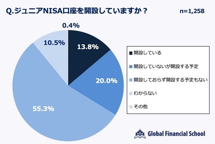 高校家庭科での必修化で話題となった「資産形成」に関する質問として、ジュニア NISA 口座の開設状況を 聞いたところ、既に「開設している」と答えた人は 13.8%にとどまりました。また投資可能期間の終了が 2023年に迫っていることを知っているのか、これから予定している人は、開設済みの人を超える 20.0%に上り、駆け込みでジュニア NISA を活用しようと考えている様子が伺えます。