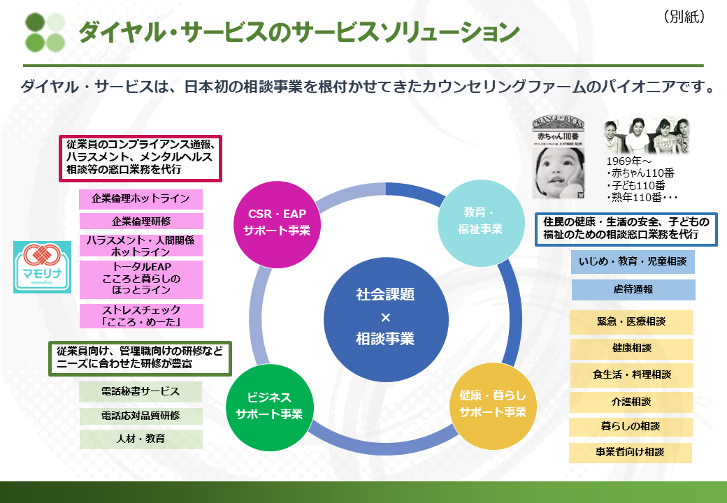ダイヤル・サービスは、日本初の電話相談サービス企業として1969年の創業以来、時代が求めるホットラインサービスを企業・自治体に開発・提供し続けています。創業から50年余にわたる電話相談サービスの経験で培った「対話の力」と「傾聴力」で、人と人、人と地域、人と企業をつなげ、誰もが幸せに暮らせるよりよい社会づくりに貢献することを使命としています。