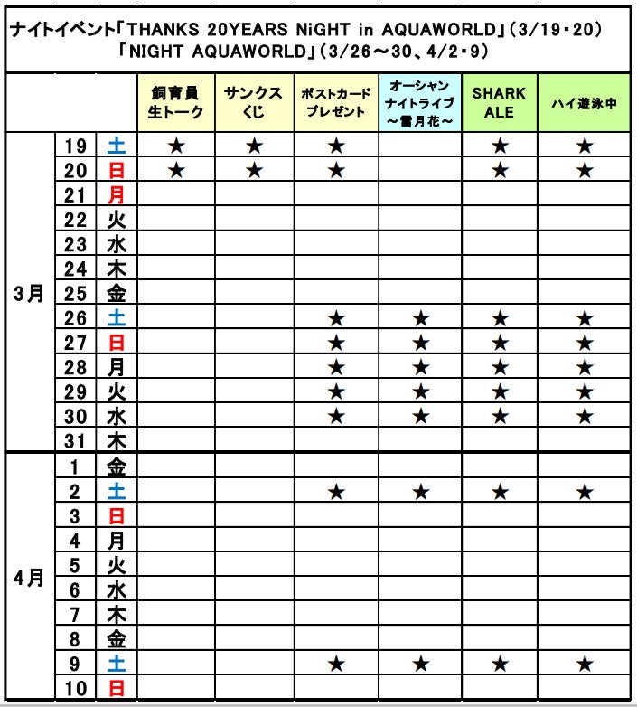 開館20周年を記念して3月に開催される「THANKS 20YEARS NIGHT in AQUAWORLD」及び「NIGHT A