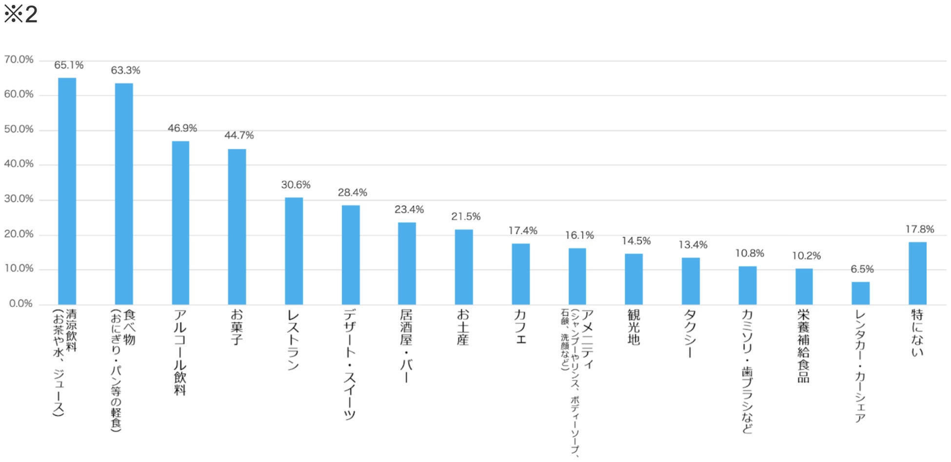また、ビジネスホテル利用時は普段の生活に比べ購買しやすいシーンであることから、宿泊先で購入されやすい清涼飲料水・アルコール・お菓子などについても高いリーセンシー効果が期待できます。(※2)