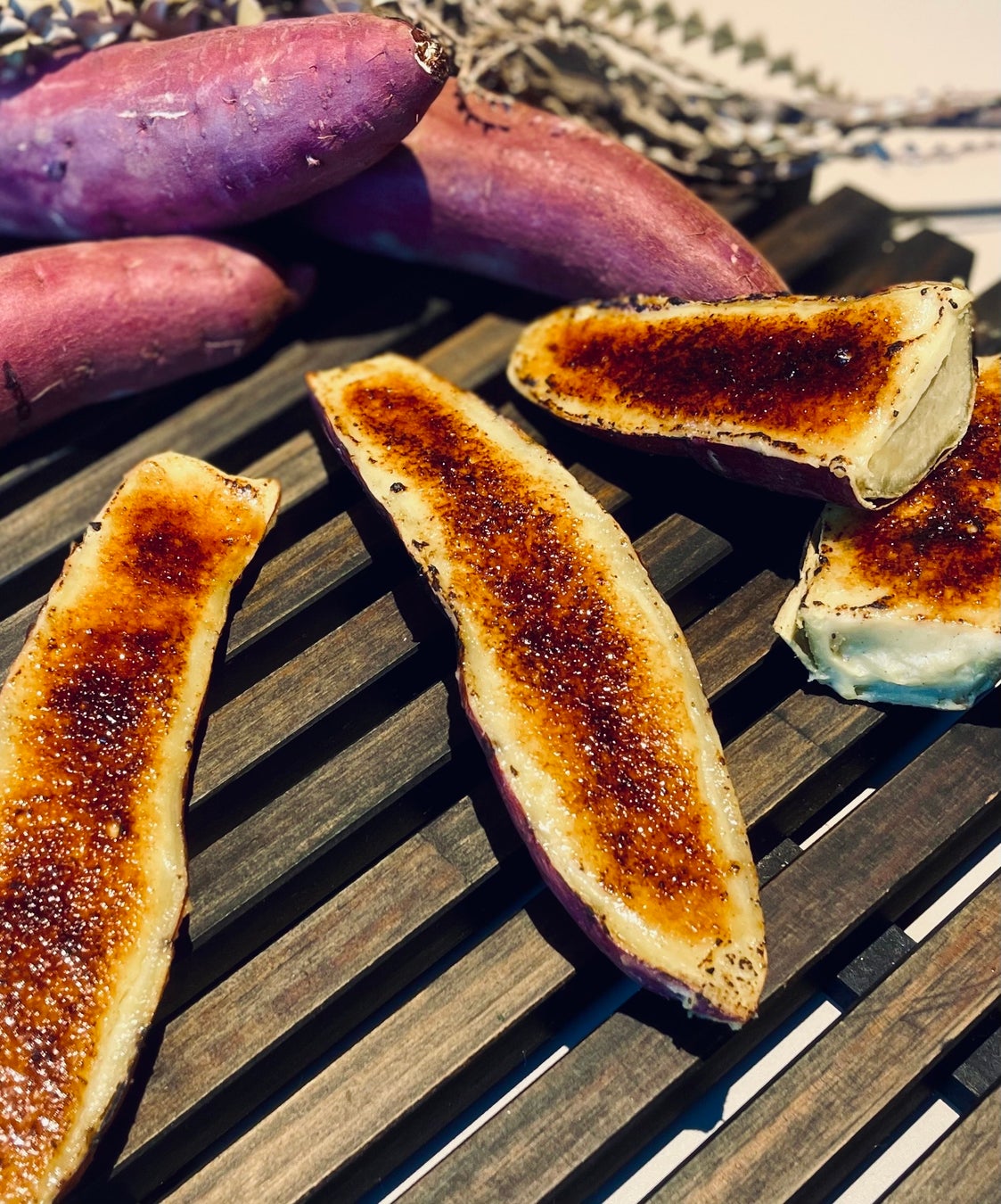 焼き芋を半分にカットし、中をくり抜いて自家製の濃厚クリームを詰め、ブリュレ風に仕上げました。クレームパティシエールとバニラ、トンカ豆、さらにアーモンドのような香りが特徴のアマレットなどを合わせた風味豊かな焼き芋ブリュレはやみつきになること間違いなし。