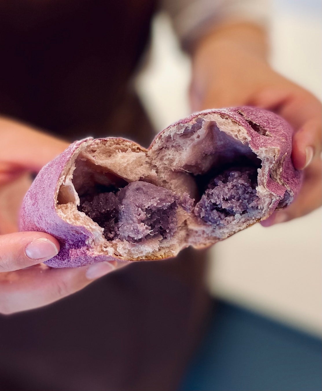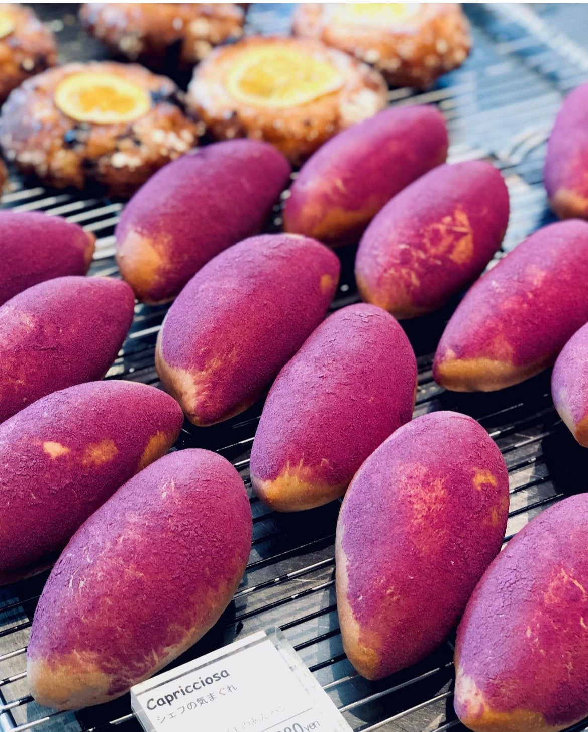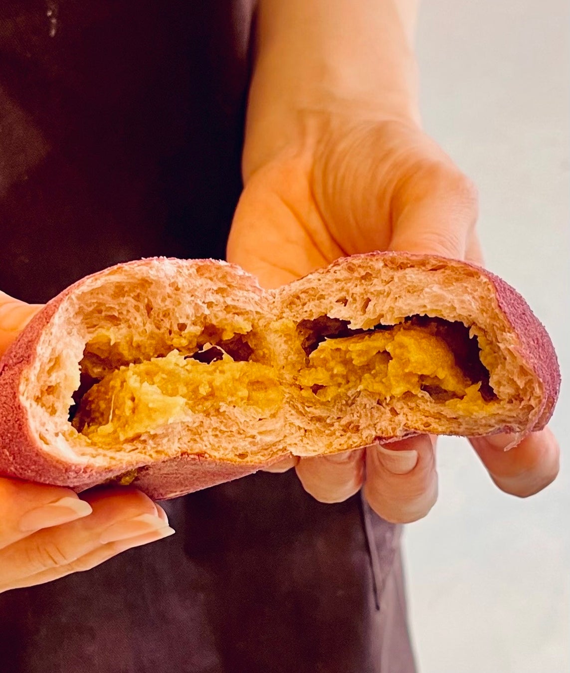 新商品の「おとなのスイートポテトブレッド」は、香り高いグラスフェッドバターや濃厚な江別産の卵、道産小麦の「キタノカオリ」と「春よ恋」をブレンドして使用するパン生地は、バターと卵とのバランスを考慮して加水率も調整し、スイートポテトブレッドのために研究を重ねて開発。「紫芋」を一度焼き芋にして、バターや生クリーム、ラム酒などを加えて作り上げる自家製スイートポテトは紫芋の甘味をいかし、生クリームのコクが味わえる仕上がりに。パン生地には紫芋のパウダーが練り込まれ、うっすら紫色に染まり、最後に紫芋のパウダーをまぶした紫芋づくし。さつまいもそのもののキュートな仕上がりに満足度MAX。