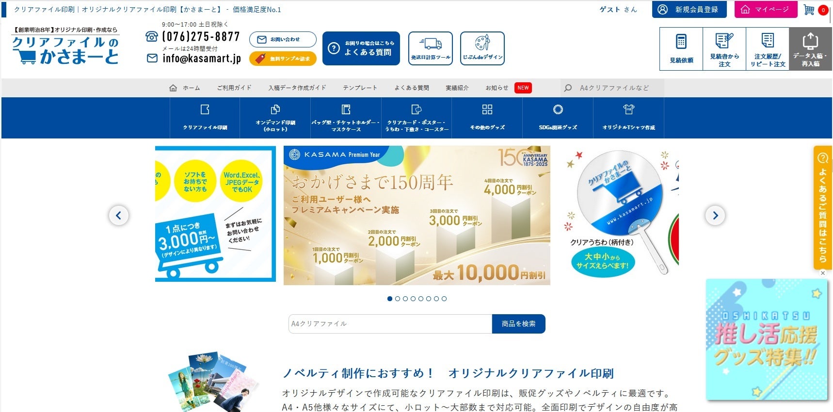 そこで、弊社が運営する『オリジナルクリアファイル印刷のかさまーと』にて、2025年6月6日より「KASAMA創業150周年記念キャンペーン」を開催いたします。