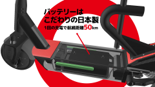 1人用モビリティで日本初の日本製バッテリーを搭載。安全性と品質にこだわった、大容量の最新CELLを採用することで、パワー不足や充電切れのリスクを軽減するだけでなく、1回の充電で50kmの走行が実現可能になります。