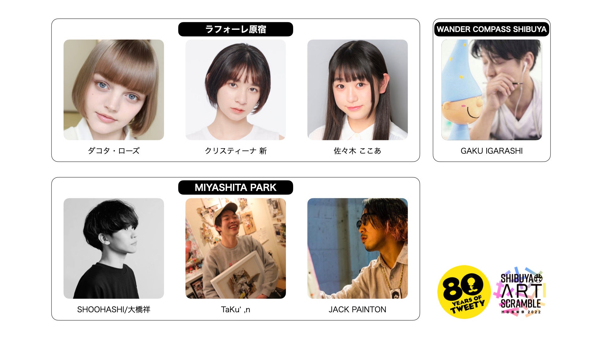 展示場所: ラフォーレ原宿、MIYASHITA PARK、WANDER COMPASS SHIBUYA、渋谷区観光協会、渋谷区文化総合センター大和田、渋谷スクランブルスクエア、shibuya-san、東京アニメセンターin DNP PLAZA SHIBUYA(渋谷MODI内)、東急プラザ渋谷、UPLIGHT CAFÉ、西武渋谷店(全11ヶ所)