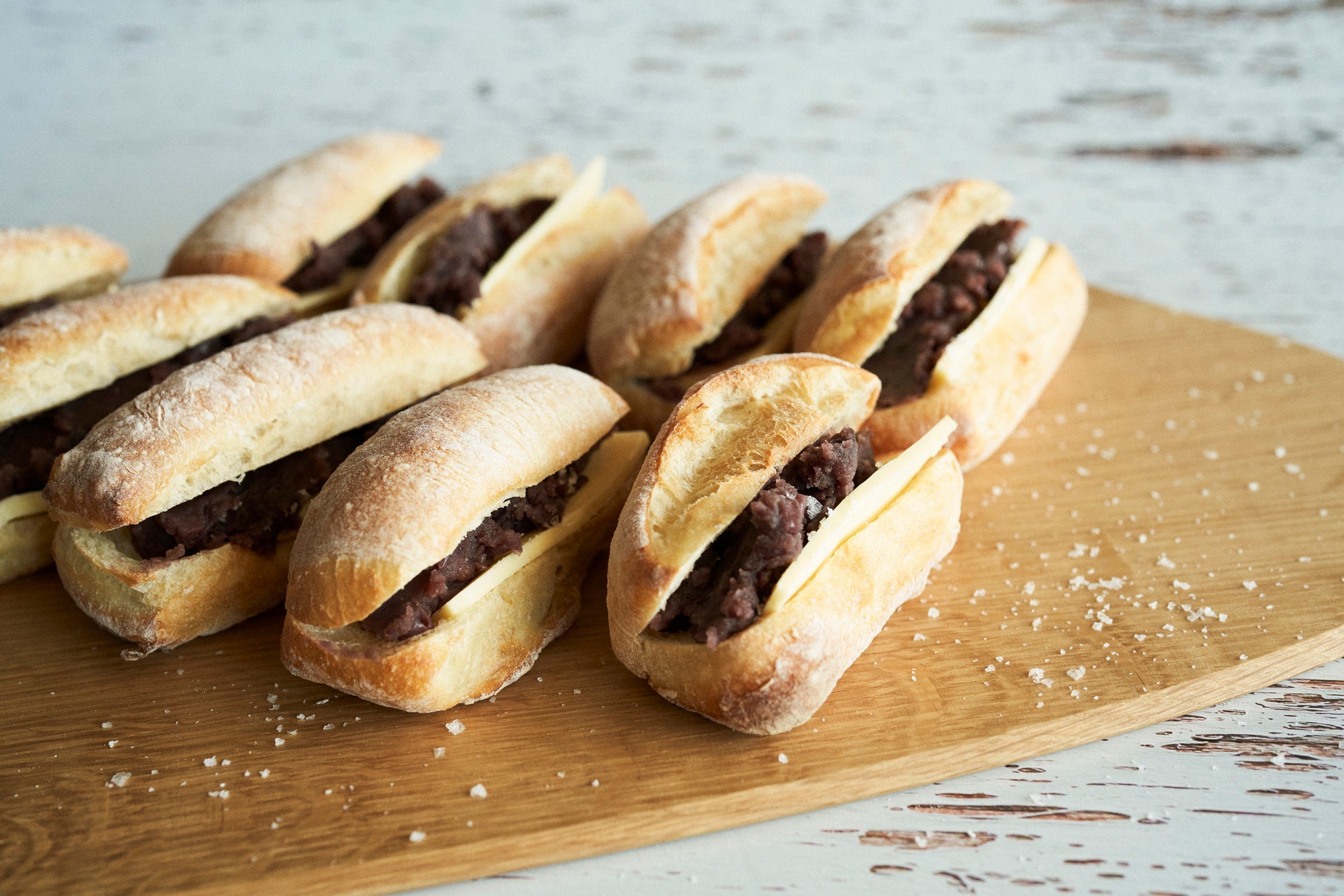 奇跡の小麦と称される希少品種の「キタノカオリ」。自家製酵母のルヴァン種を使い、水分を多く含ませて生地を仕上げることで、小麦本来のもっちりとした食感に酵母の風味が引き立ちます。このシグニチャーのチャバタに、コクのある北海道産の発酵バターと、北海道産エリモ小豆を使ったほどよい甘さの餡子を合わせました。ほんの少し加えた国産フルール ド セル(天然海塩)がアクセントに。チャバタとのバランスを計算し尽くしたあんバターサンドです。