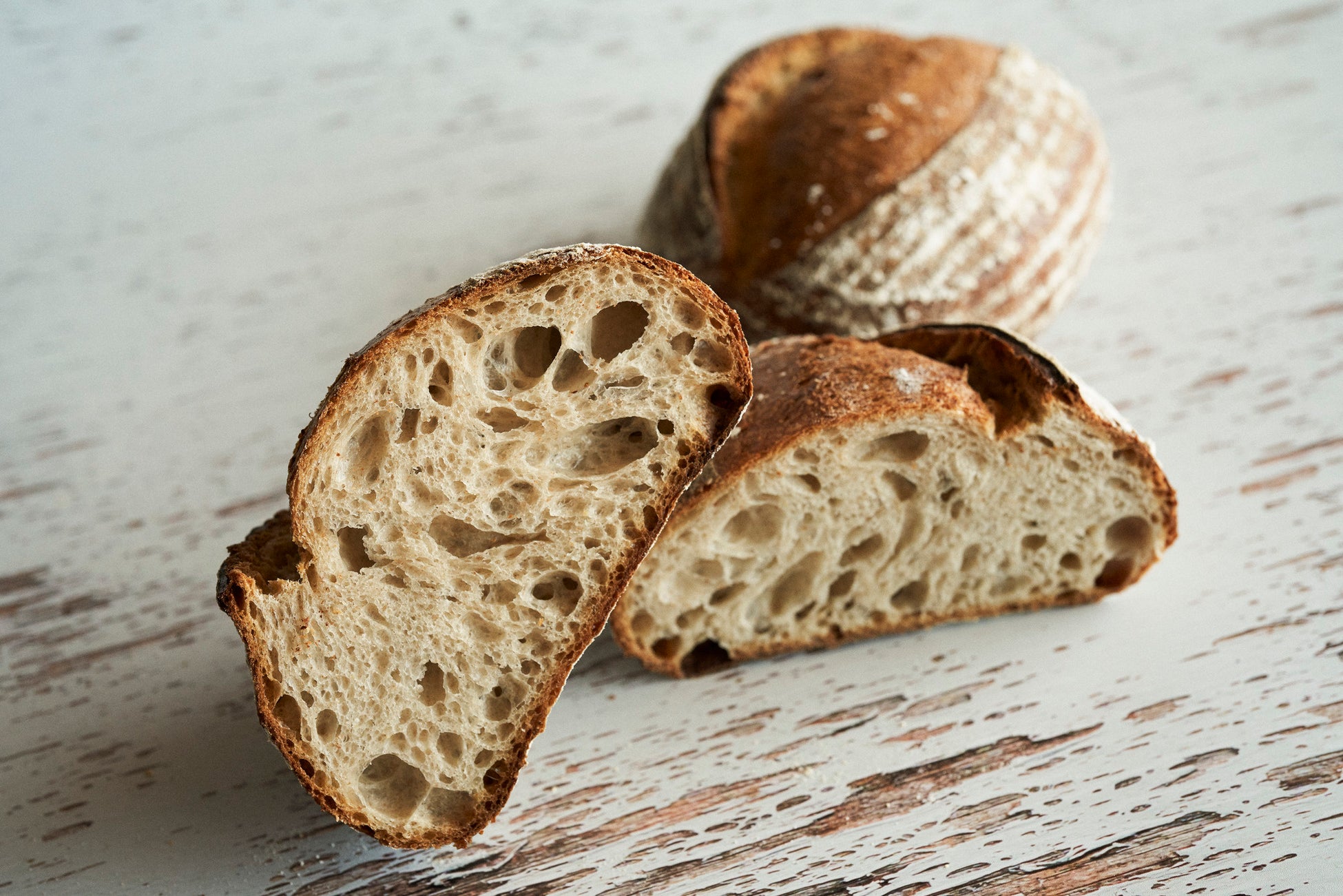 香りが立ち、香ばしさのなかに甘みもある小麦「はるゆたか」を用いて、プレーンタイプ、味噌&クルミチーズ、レーズン、ゴマなどの数種をご用意。パン酵母を用いず自家製酵母のルヴァン種のみで生地を仕込み、成形後に1日かけてゆっくりと発酵させます。熟成させた後、高温でしっかりと焼き込みます。歯切れのよいクラストと水分を含んだクラムが小麦の風味を醸し出します。