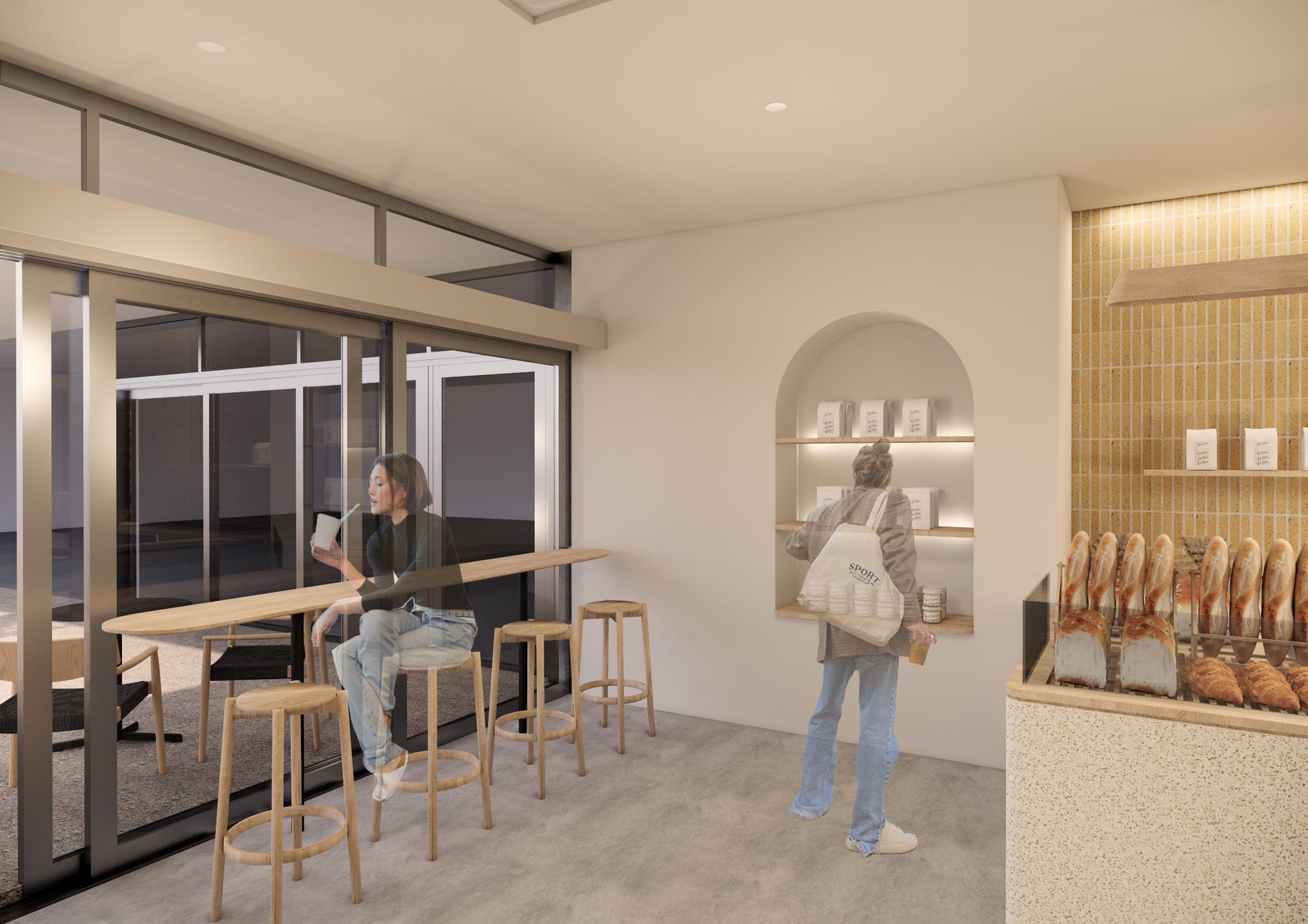 店内デザインは、国内外で活躍する芦沢啓治建築設計事務所が担当。奥に大きな窓を配した厨房があり、焼き立てのパンを対面式カウンターに常時40種ほど並べ、スタッフがお客様のご希望のパンをお取りいたします。またイートインスペースも設けてソファ席などを配し、居心地のよい空間を演出いたします。