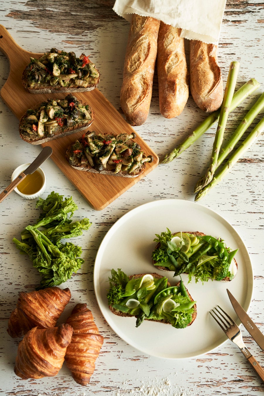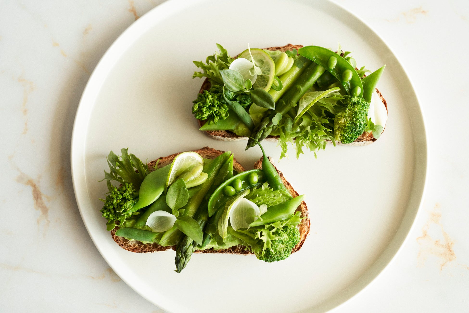 スライスしたパン オ ルヴァンに、ミルクとバターでグリーンピースの甘みを引き出したペーストを塗り、グリーンアスパラガス、ブロッコリー、インゲンなど、緑の野菜を美しくトッピング。旬野菜の旨みにペーストのコクが絶妙なハーモニーを奏でます。
