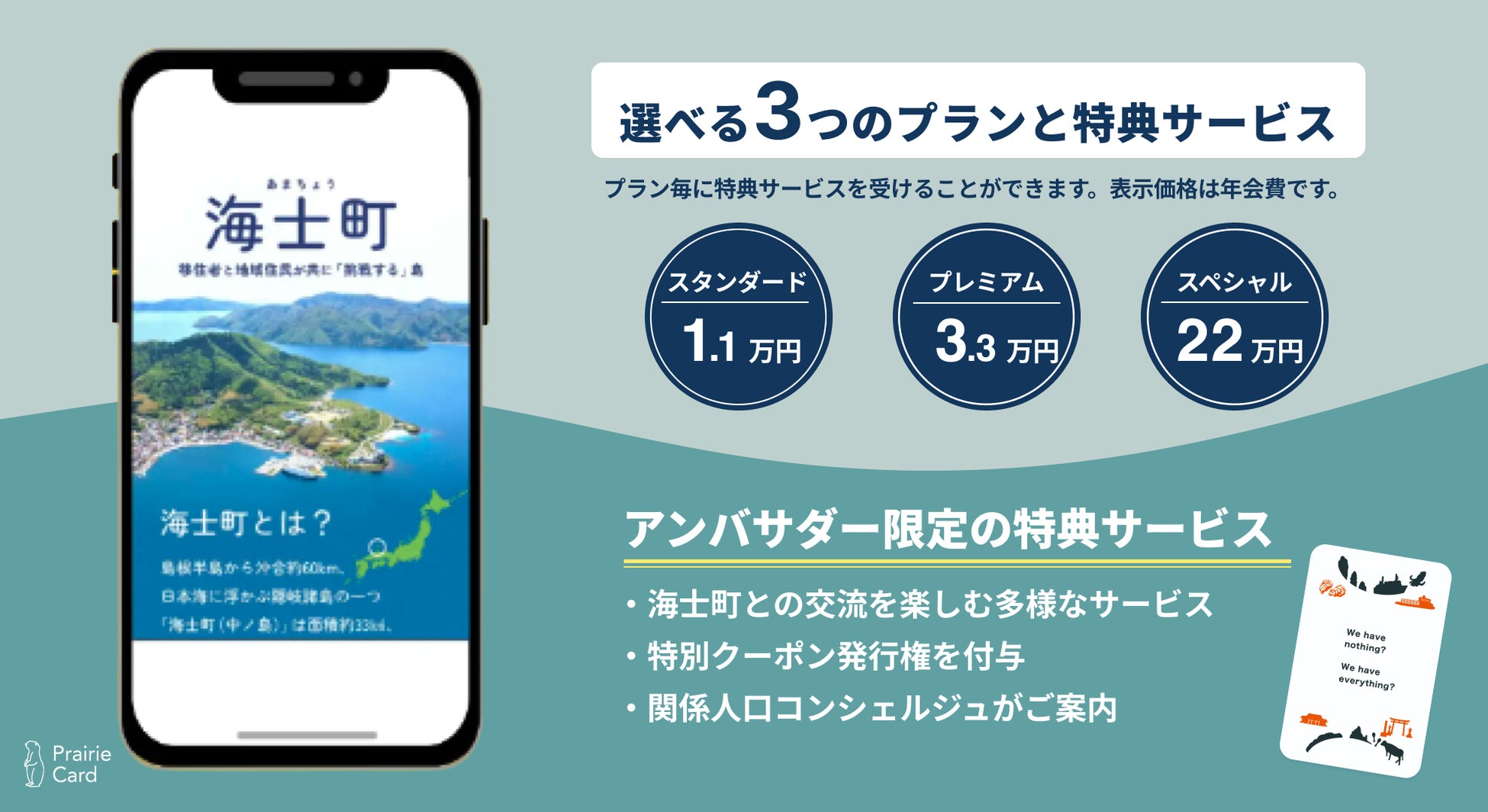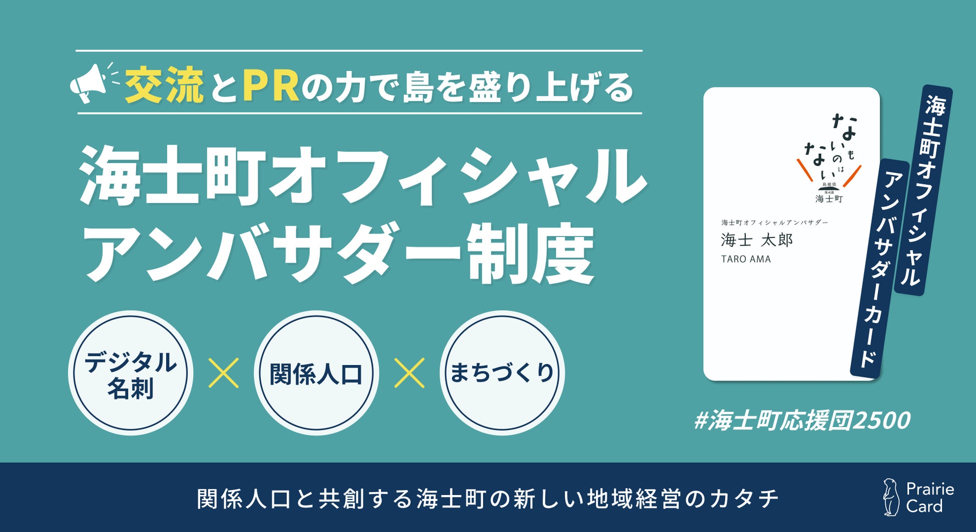 「新しい出会いの文化を創造し、コミュニケーションを豊かにする」をミッションにかかげる株式会社スタジオプレーリー(本社:東京都渋谷区、以下当社)は、島根県海⼠町(町⻑:⼤江 和彦、以下「海⼠町」)と共に、デジタル名刺サービス「プレーリーカード」を活用した取り組みである「海⼠町オフィシャルアンバサダー制度」を11月よりスタートします。本制度を通して、関係⼈⼝の⽅々と島との関係性の深化を⽬指し、また、海⼠町の認知拡⼤と新たな海⼠町ファンの増加を目指します。