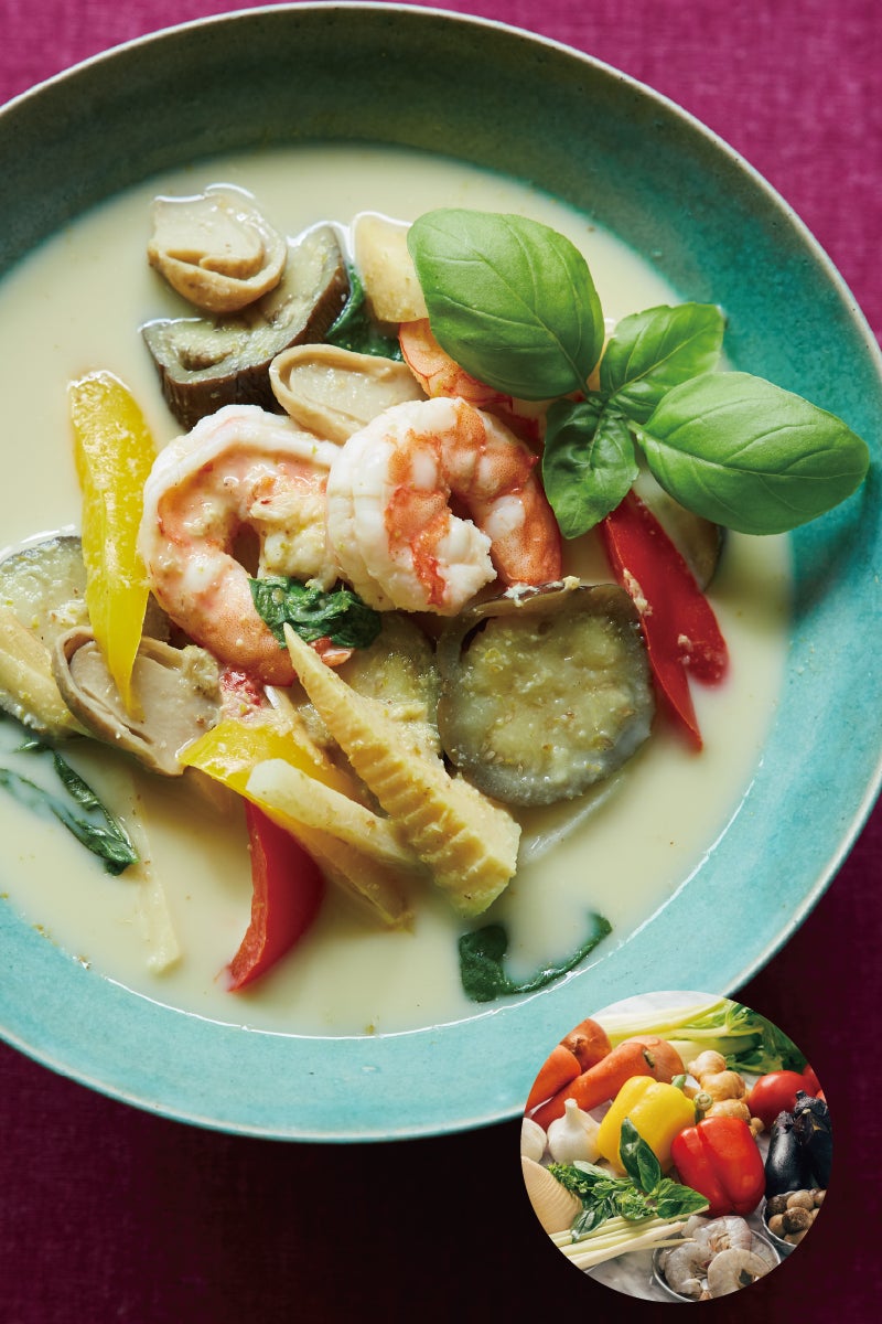 【原材料名】 なす(国産)、たけのこ、パプリカ、えび、ふくろたけ、グリーンカレーペース ト、乳等を主原料とする食品、砂糖、片栗粉、野菜ブイヨン、魚醤、バジル、レ モングラス、こぶみかんの葉、(一部に乳成分・小麦・えび・大豆・魚醬(魚介 類)を含む)