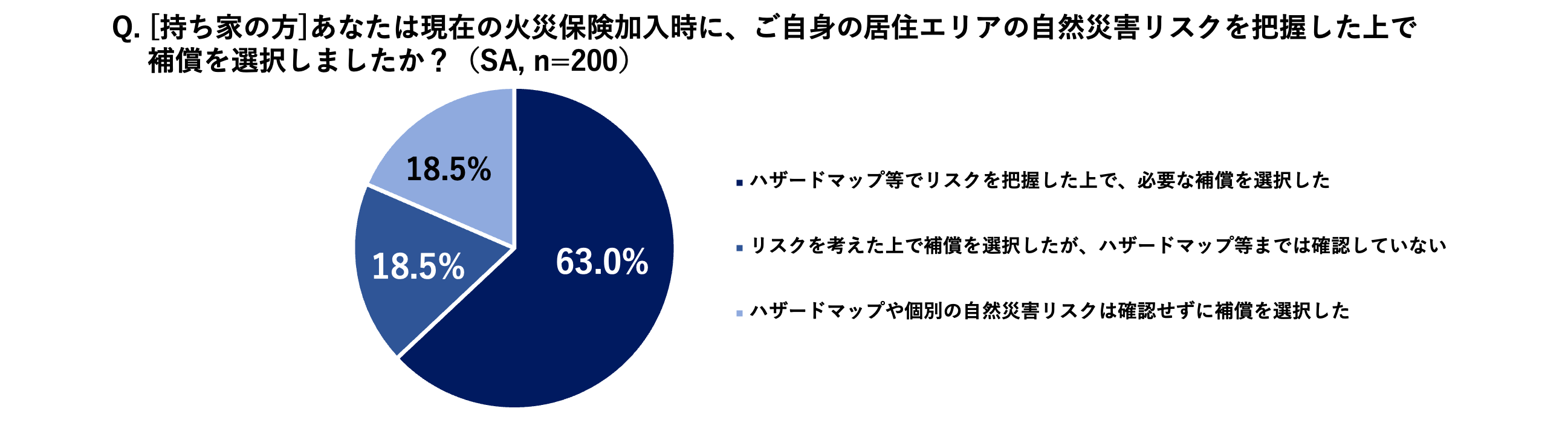 持ち家に引越しした人に対して、加入中の火災保険について聞いたところ、約3人に2人(63%)が「ハザードマップ等でリスクを把握した上で、必要な補償を選択した」と回答。ハザードマップまでは確認していないもののリスクを考えた上で補償を選択した人を含めると合計で81.5%となりました。