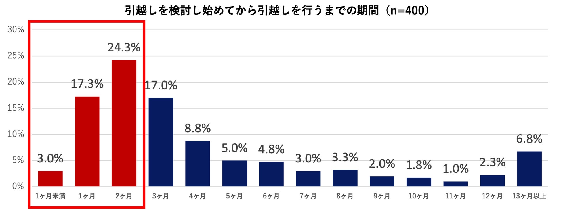 今回の調査の結果、引越しの検討を開始してから実際に引越すまでに要する時間は、平均で4.5ヵ月という結果となった。その中でも、引越しの検討を開始してから2ヵ月以内に引越しを行う人は約4割を超え(44.5%)、さらに1ヵ月以内に行う人は約2割(20.3%)と、多くの人が引越しを検討し始めてから短期間で引越しを実施したことがわかりました。
