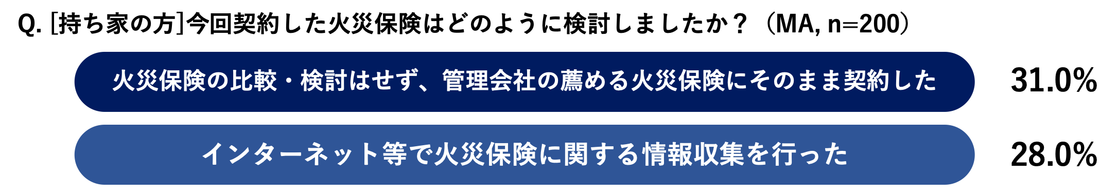 ・持ち家に引越しした人は、「インターネット等で火災保険に関する情報収集を行った」という回答が28%と4人に1人以上に。「管理会社の薦める火災保険にそのまま契約した」人が依然として31%いるものの、自ら積極的に比較検討をオンラインで行っている人が同程度の割合存在しており、引越しにおいて、自然災害リスクや火災保険についてしっかりと理解を深めようとしている人が多い結果となった。