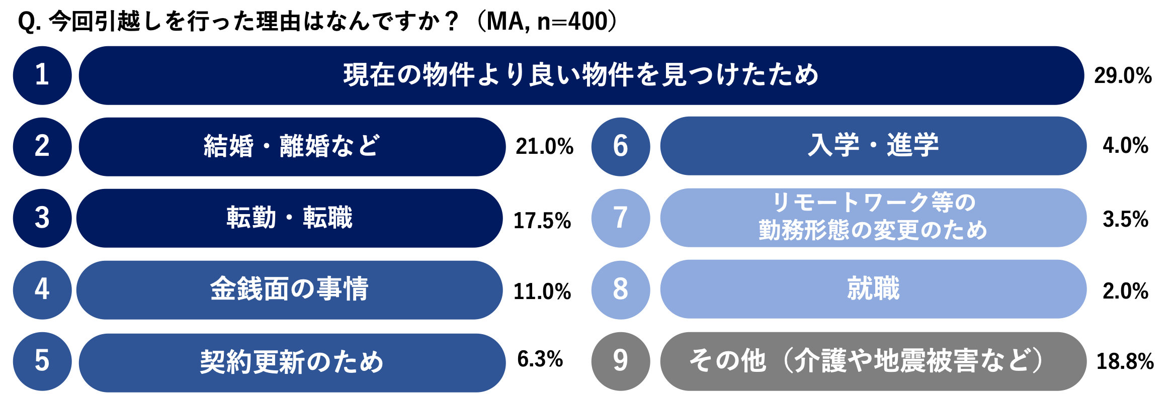 コロナ禍において住居にかける費用は上昇している一方で、引越しを行った理由で「リモートワーク等の勤務形態の変更のため」を選択した人は全体のわずか3.5%という結果になりました。引越しの理由としては、「現在よりもより良い物件を見つけた」が29%、「結婚・離婚など」が21%、「転勤・転職」が17.5%などと、一般的な理由が上位を占め、新型コロナウイルスの感染拡大が引越し理由や物件選びにあまり大きな影響を与えていないことがわかりました。