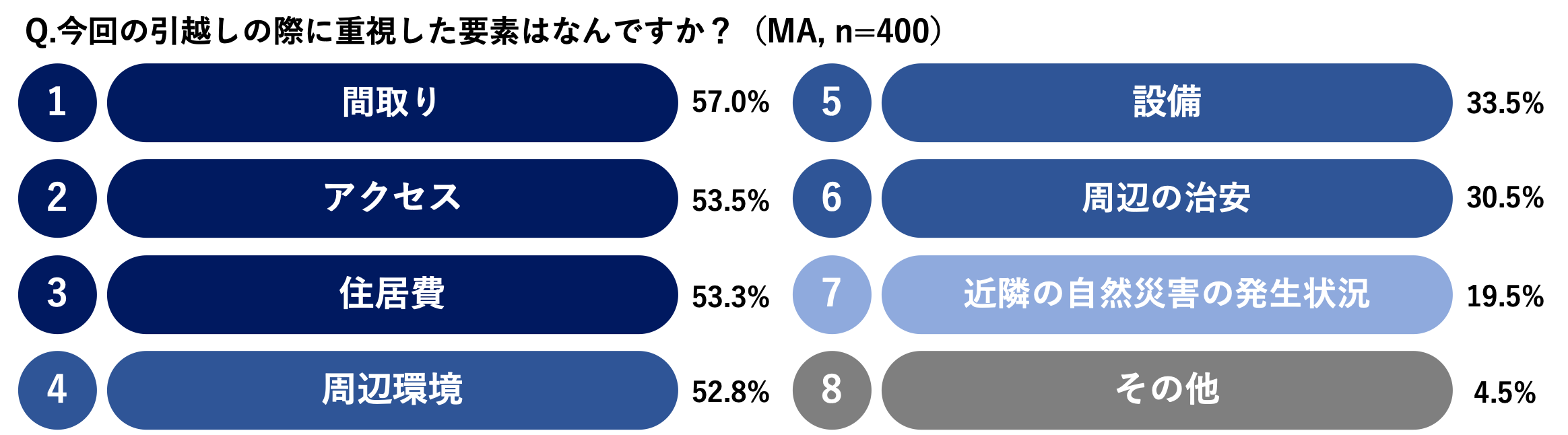 400人に対して、引越しの際に重視した要素を聞いたところ、約20%(19.5%)が「近隣の自然災害の発生状況」を選択していることがわかりました。特に、持ち家へ引越しした人は、全体より多い31%と、約3人に1人が「近隣の自然災害の発生状況」を重視するなど、昨今の自然災害の増加による意識の高まりが引越しに影響を与えていることがわかる結果になりました。