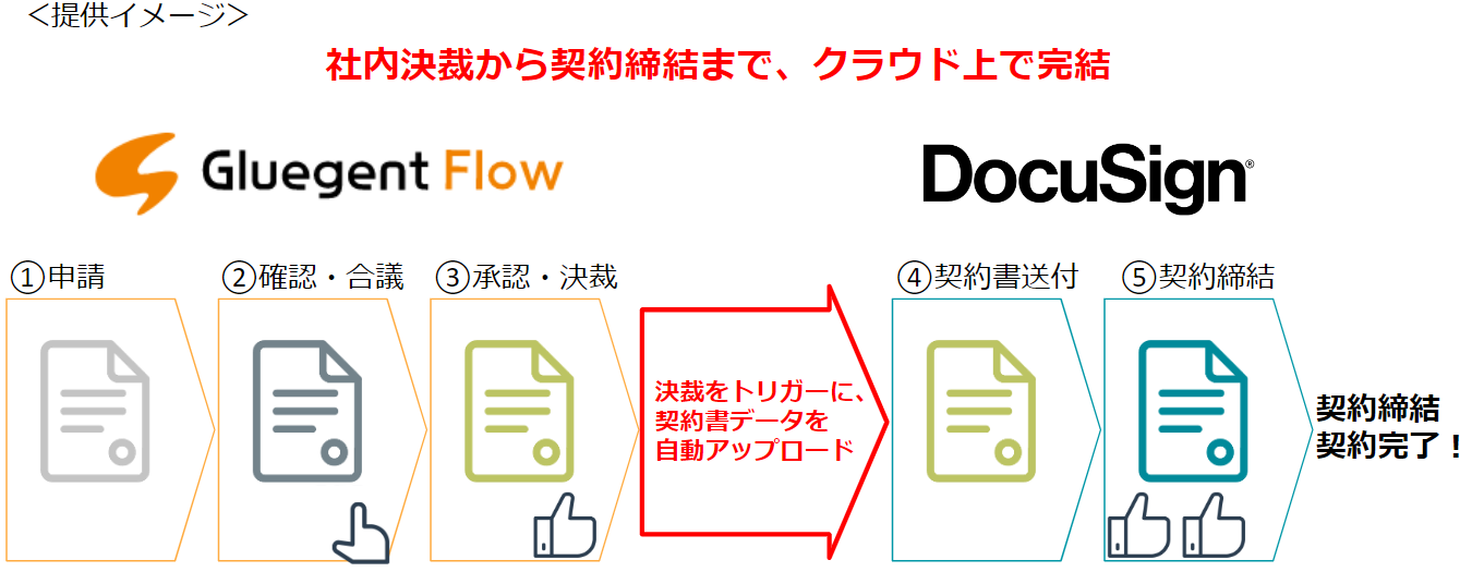 「Gluegent Flow / Gluegent Flow Plus」は、申請・承認・決裁といった一連の社内業務をクラウド化したワークフローシステムです。一方、ドキュサインは世界180ヶ国100万社以上に導入され、10億人以上のユーザーが使用*3する「DocuSign eSignature」を中核とした電子署名サービスを提供しています。両サービスを連携した「Gluegent Flow / Gluegent Flow Plus 電子契約連携 for ドキュサイン」では、システム間を自動連携することで人的ミスをなくし、社内稟議から締結までの業務プロセスを一気通貫に行います。また、国内外で広く利用されているドキュサインとの連携は、海外法人契約との契約手続を迅速かつ円滑に行うことが可能です。本サービスの活用によって、クラウド上での一元管理による業務プロセスの可視化、業務の効率化が可能となり、契約関連業務のDXに貢献します。