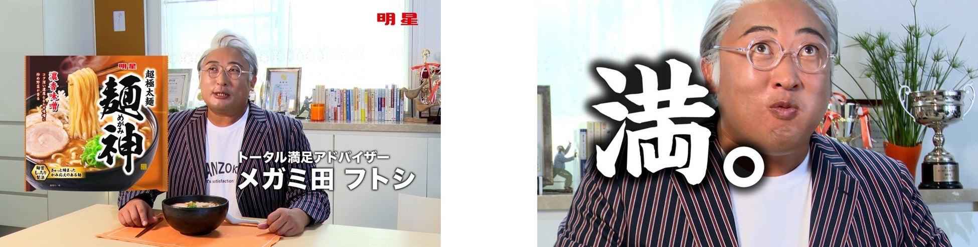 超極太麺に超濃香味噌スープが絡んで満足感の高い袋麺「麺神」の魅力を、トータル満足アドバイザーならではの、クセのある印象的な表現で伝えます。「麺神に満足感はない」という商品の否定ともとれる言葉で口火を切った彼が麺神をどう評価したのか、全貌はぜひCMでご確認ください。