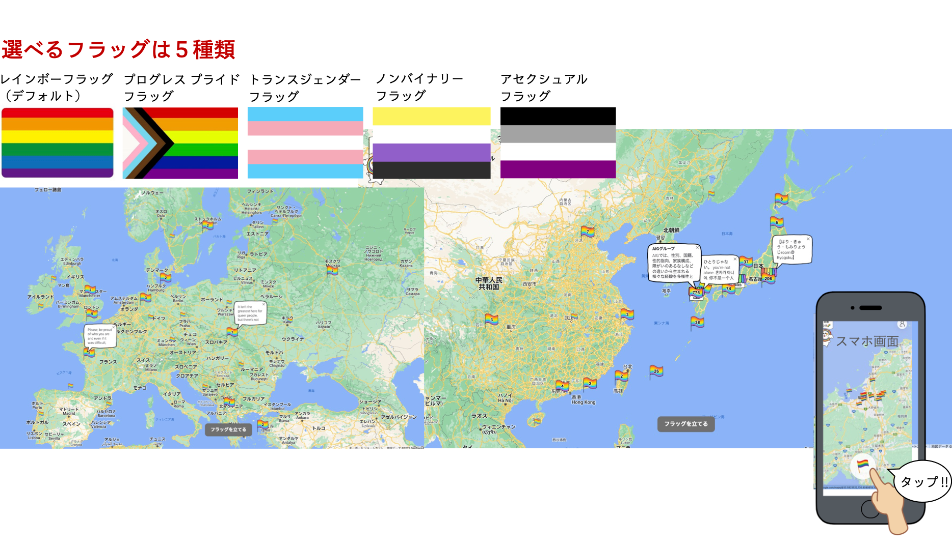 ご自身の住んでいる場所にマーカーを合わせてフラッグを立てるだけという手軽さもRainbow Mappingの魅力の一つ。(フラッグは自動で50mずれるように設定されていますので、実際の居場所が表示されることはありません。)また、写真やメッセージを添えることも可能ですので、LGBTフレンドリーな企業やショップと当事者を繋ぐパイプラインとしてもご活用いただけるサービスです。