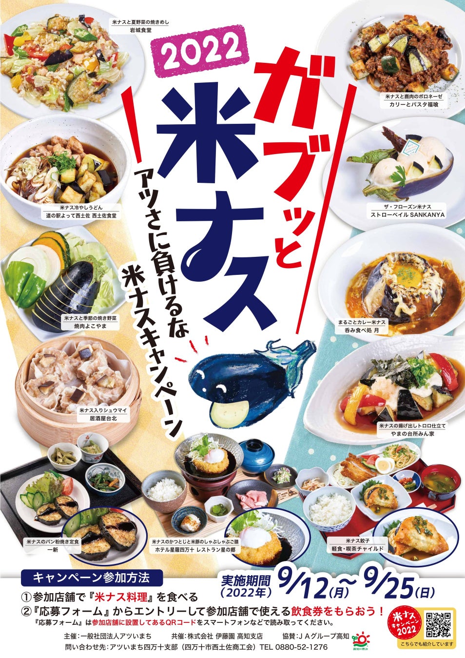 2022年9月12日(月)〜25日(日)に日本の歴代最高気温を記録した5都市の飲食店において、四万十産の米ナスを使った料理を提供する「ガブッと米ナス」キャンペーンを実施致します。