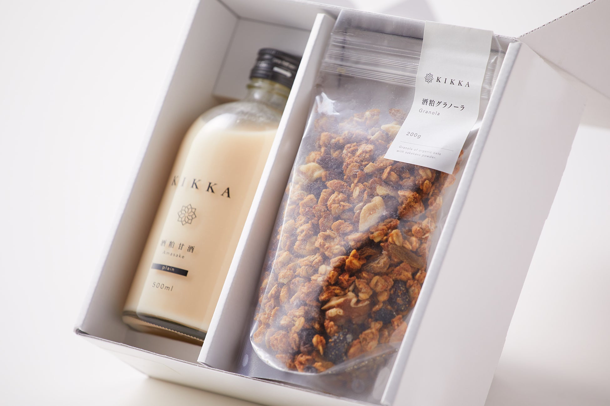 『こめどりーみんぐ』では、ノンアルコールの甘酒と酒粕で焼き上げたグルテンフリーのグラノーラを、お洒落な箱に入れてご用意しています。お祝いや手土産などのギフト、誕生日の贈り物としてご購入ください。
