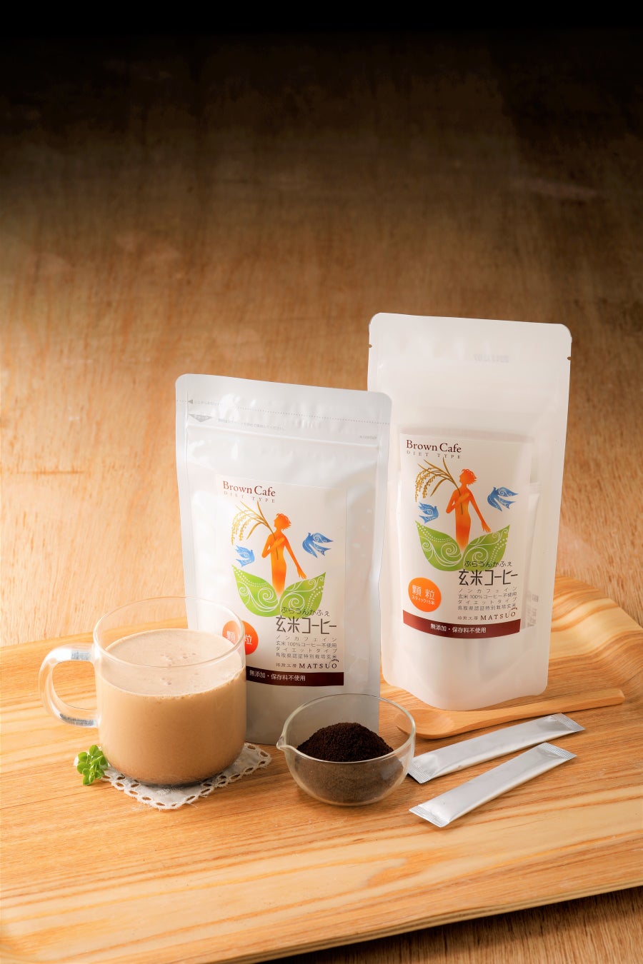 「ぶらうんかふぇ玄米コーヒー」は、玄米を丸ごと飲むという新しい感性で作られた飲み物で、化学肥料を使用せずに育てられた鳥取県産有機JAS認証玄米100%を使用しています。