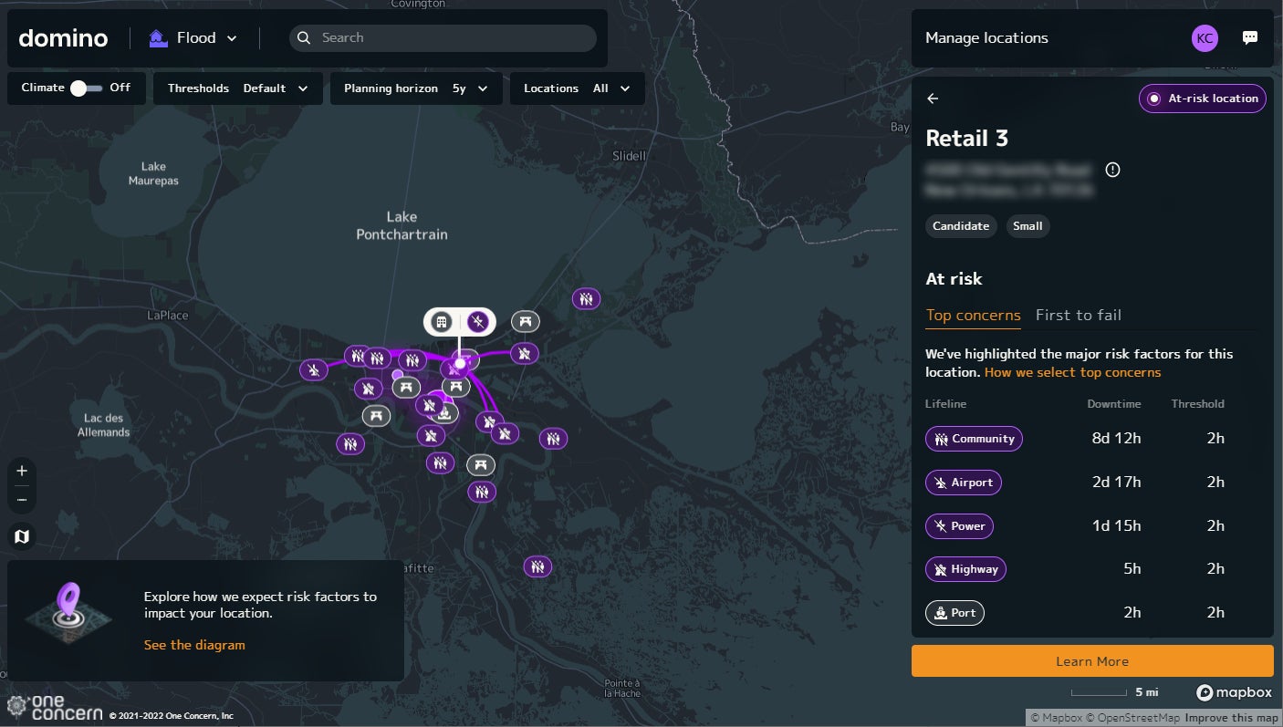 ● One Concern Domino™:企業の個々のアセットやそれに関連するビジネスインフラの気候の影響を評価し、何が最初に被害を受け、事業中断の引き金になるかを予測する、企業向けのSaaSプラットフォーム