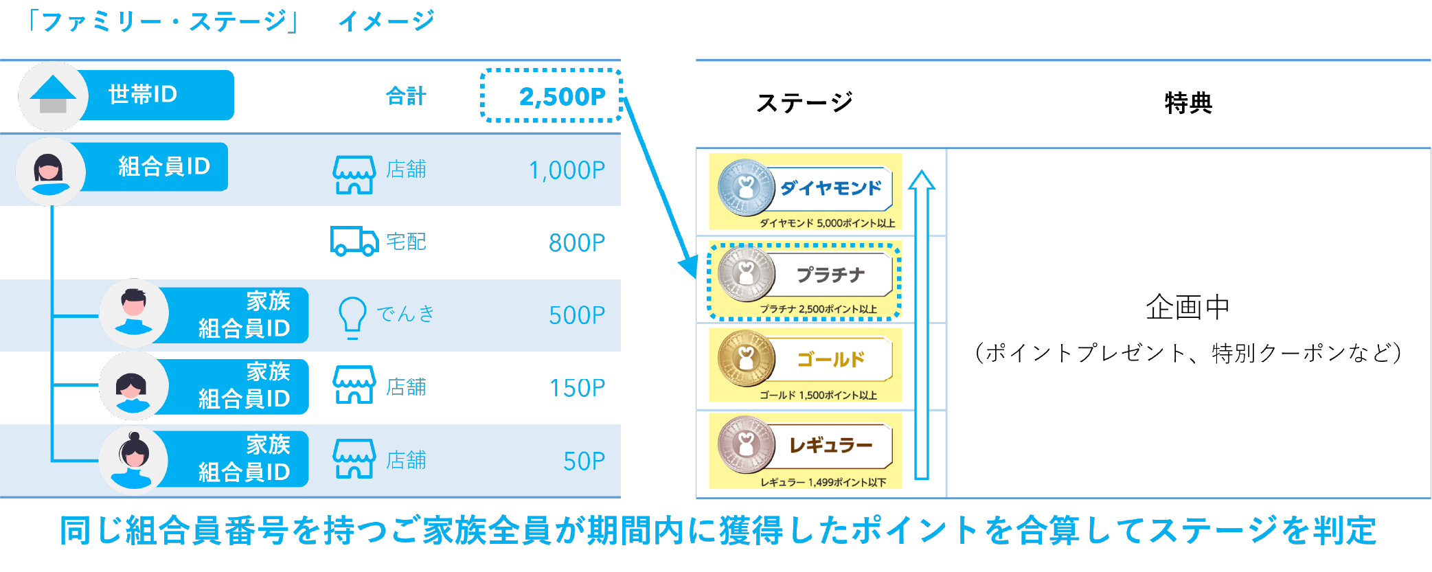 コープこうべのさまざまなサービスを利用し獲得できるポイントを世帯単位で合算し、合計獲得ポイント数によりステージを判定。ステージに応じたさまざまな特典を、現在、企画中です。