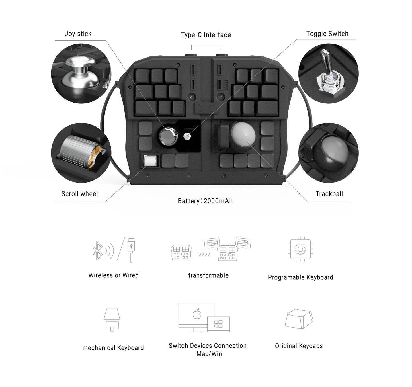 持つことができるという特徴と、変形して机の上に置くことができるという特徴を持つ。 世界初、日本発信の新しい形のキーボード。