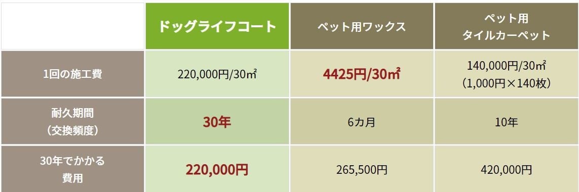 ペット用ワックスやペット用タイルカーペットは初期費用は安価ではあるものの、経年による消耗や汚れの付着が生じる為、30年で試算した場合、ドッグライフの施工日が割安となります。
