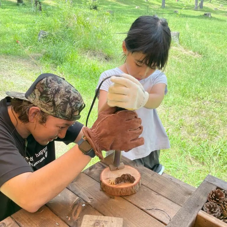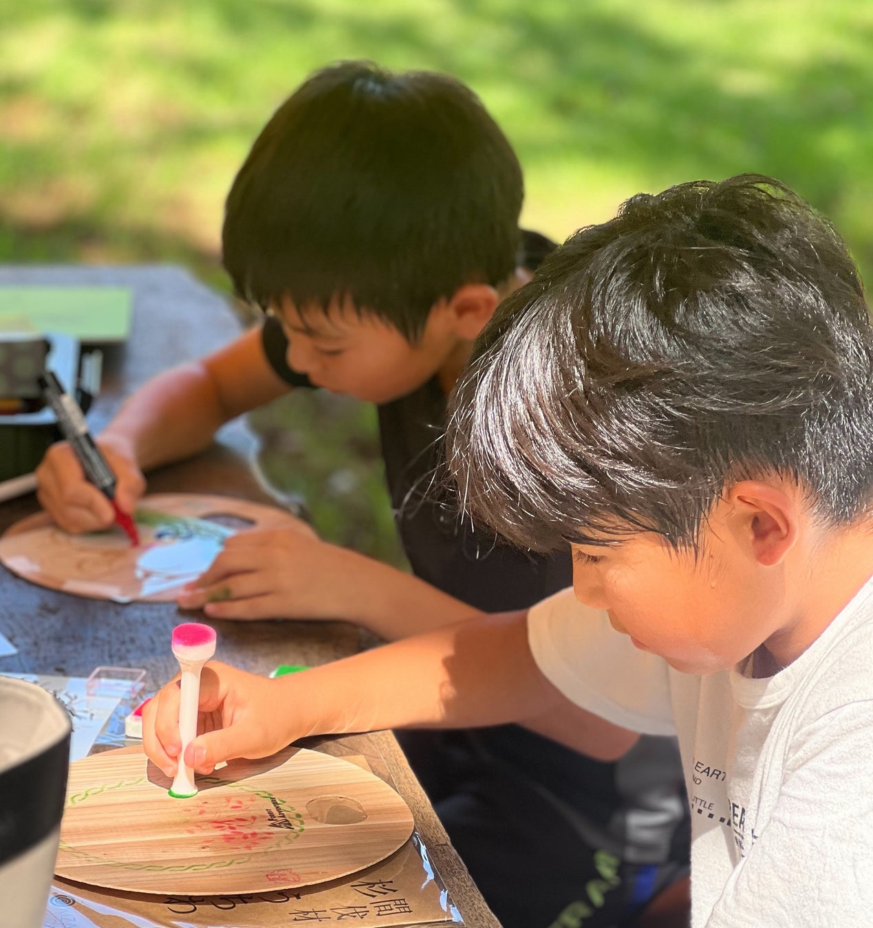 森でしかできないことを夏休みの自由研究として自然学習体験を深めていただきたいと思い、間伐材をつかった木のうちわやまつぼっくり等の森の端材でつくるフォトスタンドなどのクラフト体験、カブトムシの採集体験、ビオトープなど施設ごとに様々な取り組みを実施しております。