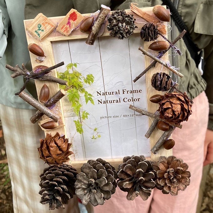 杉の間伐材で作成した木のうちわにデコレーションして、オリジナルの木のうちわの作成や、ドングリや松ぼっくりでデコレーションしたフォトスタンドなどを作成