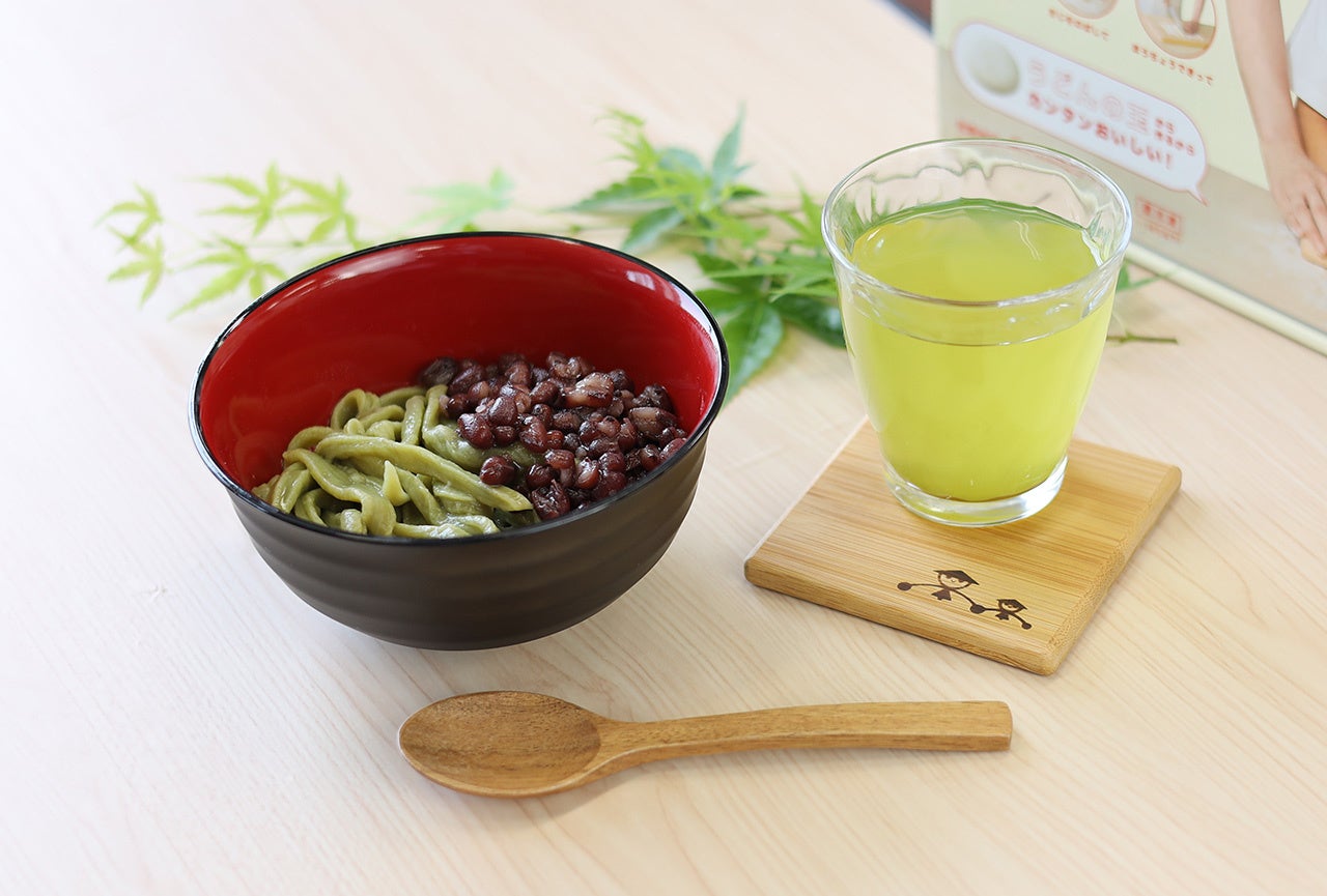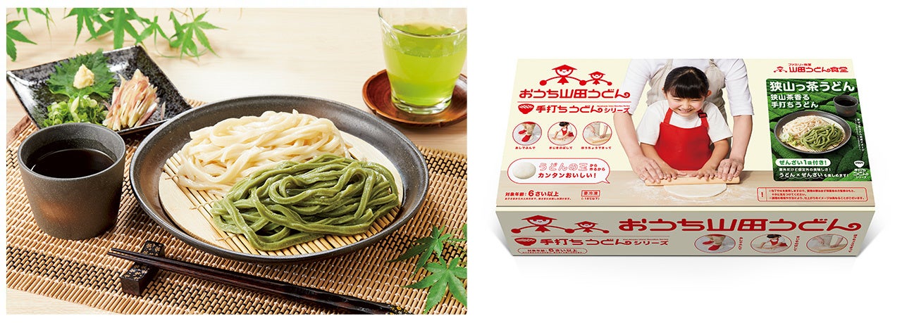 着色料不使用!風味豊かな狭山茶が練り込まれた緑のうどん玉を使って、手打ちうどんはもちろん、ぜんざいうどんとしても楽しめます!通販サイト「おうち山田うどん」にて5月20日(金)より期間限定で好評販売中!