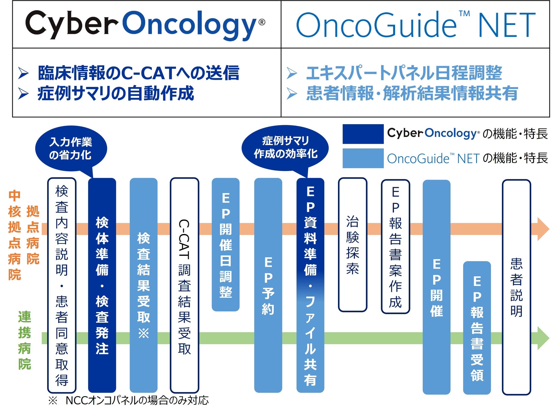 「CyberOncology®」にて、構造化されたデータベースを活用し、がんゲノム情報管理センター※6(以下、C-CAT)への臨床情報の送信が可能※7です。また、エキスパートパネルにおける資料(症例サマリ)は、「CyberOncology®」によりベースファイルが自動作成され、「OncoGuide™ NET」へスムーズに転送することができます。