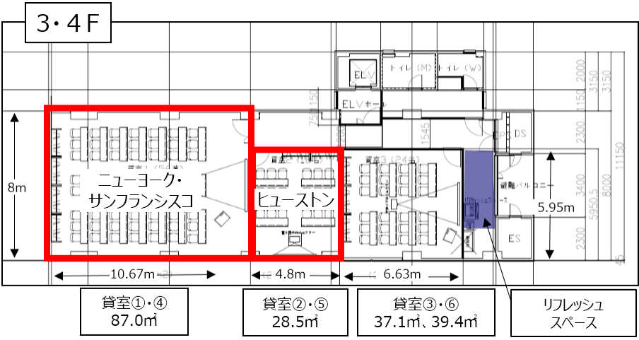 募集中の「ニューヨーク」「サンフランシスコ」は84m2、最大56名までご利用可能です。空気の入れ替えができる窓があり、開放的な空間です。「ヒューストン」は28.5m2、最大18名までご利用可能です。審査開始から2週間で入居可能、机・椅子・Wi-Fi等完備。低コストでビジネスを開始できるオフィス環境を整備しました。新型コロナウイルス感染症対策として、飛沫感染防止のアクリルパネルを各スペースに順次設置中です。