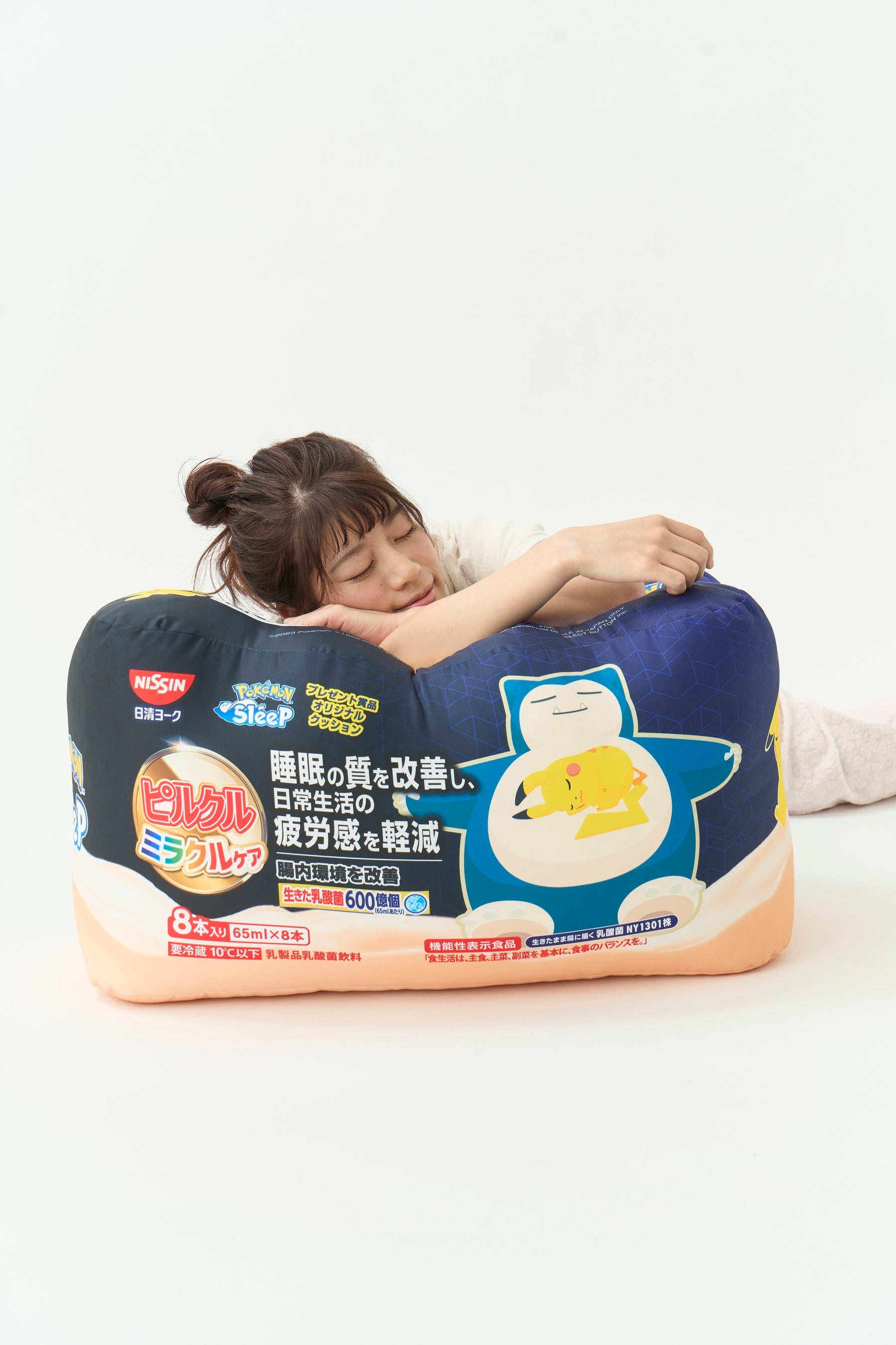 「ピルクル ミラクルケア Pokémon Sleepパッケージ 65ml×8(カビゴン)」を模した特大クッション。